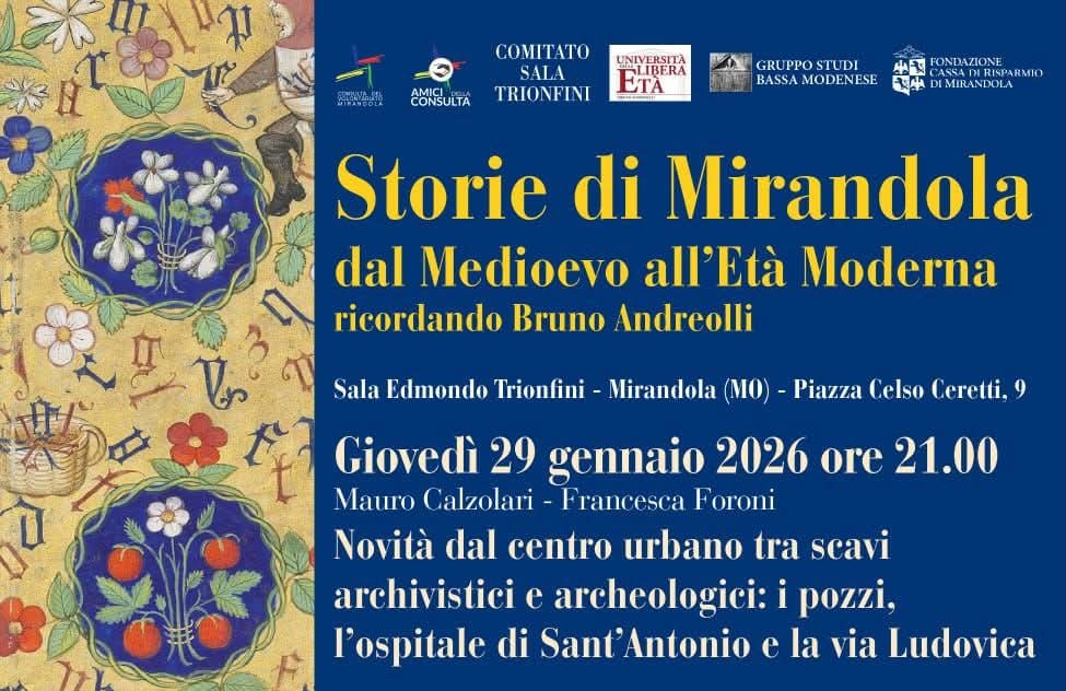 Parte la rassegna di conferenze: Storie di Mirandola dal Medioevo all'Età Moderna, ricordando Bruno Andreolli. Il primo appuntamento é giovedì 29 gennaio 2026 alle ore 21.00, presso la Sala Trionfini di Piazza Celso Ceretti 9 a Mirandola, dove Mauro Calzolari e Francesca Foroni parleranno delle "Novità dal centro urbano tra scavi archivistici e archeologici: i pozzi,...