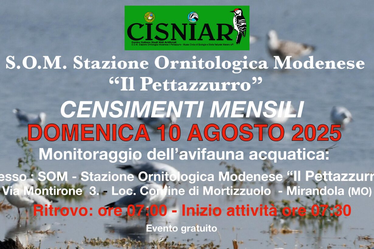 Censimenti S.O.M. "Il Pettazzurro" DOMENICA 10 agosto 2025 alle ore 07:00 presso la S.O.M. Ritrovo ore 07:00, inizio ore 07:30 Verranno censite le zone umide della Bassa Modenese. Ci suddivideremo in squadre e si procederà con i censimenti che termineranno indicativamente alle ore 12:30 circa. Tutti sono ben accetti, i più esperti ma anche quelli [...]