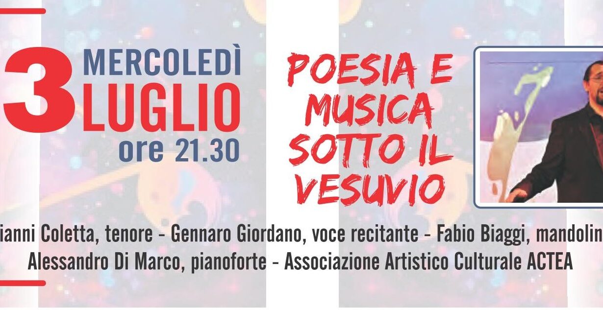 Mercoledì 23 luglio, alle 21.30, sarà protagonista Napoli con lo spettacolo, a cura dell’associazione artistico culturale Actea, “Poesia e musica sotto il Vesuvio” che vedrà esibirsi il tenore Gianni Colletta e i musicisti Fabio Biaggi (mandolino) e Alessandro Di Marco (pianoforte), accompagnati dalla voce recitante di Gennaro Giordano.