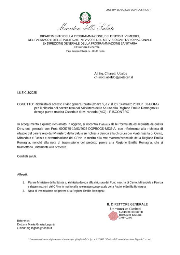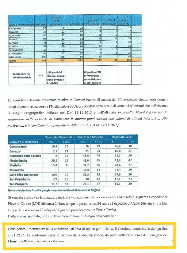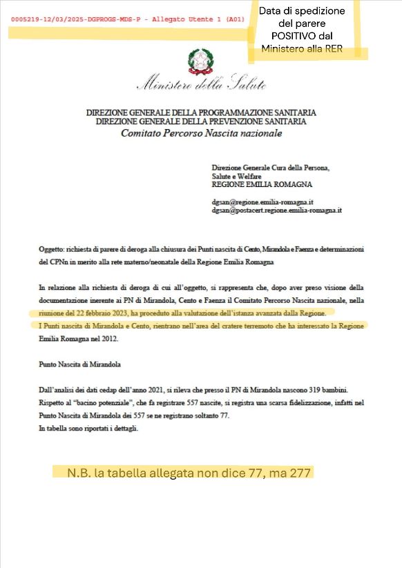 Un bravo e solerte cittadino di Mirandola, a febbraio 2025 ha deciso di rivolgersi direttamente al Ministero della Salute per avere notizia della deroga al nostro Punto Nascita ed ha avuto risposta: il Comitato Percorso Nascita nazionale ha preso in carico la domanda di deroga a il 25 gennaio 2023 e si è espressa positivamente già il 22 febbraio 2023, con durata della deroga stessa fino al 31 dicembre 2025! Quel bravo cittadino ha pubblicato la risposta e da quel momento tutti abbiamo pensato che la Regione aveva deciso di non ascoltare il ministero e per questo non aveva riaperto il nostro Punto Nascita, mentre l’Assessore Regionale alla Salute Massimo Fabi, già contrario a riaprire il Punto Nascita di Mirandola, continuava comunque ad asserire che tale parere, dalla richiesta di deroga, non era mai arrivato.