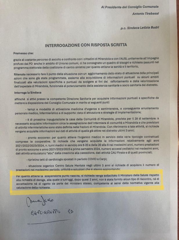 - Perché il Consiglio Comunale di Mirandola in primis e tutti quelli dell’UCMAN, dopo la “sospensione temporanea” del nostro Punto Nascita, non si sono più preoccupati delle oltre 550 partorienti della Bassa? Forse se a settembre 2024, ci fosse stata un’intesa trasversale in Consiglio Comunale a Mirandola, sulla richiesta di Anna Greco per sollecitare il Ministero sulla deroga al nostro Punto Nascita, si sarebbe potuto avere la risposta positiva che giaceva al Ministero della salute da febbraio 2023!