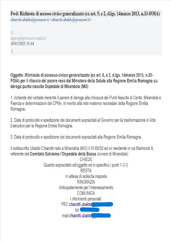 A questo punto ho deciso di fare anch’io un accesso civico al Ministero della salute, aggiungendo la richiesta specifica della data di spedizione della suddetta documentazione alla RER; dal Ministero hanno risposto anche al sottoscritto, con la stessa documentazione già messa in rete dal bravo cittadino sopracitato e con la data di spedizione alla RER, cioè 12 marzo 2025, ben 25 mesi dopo che la commissione nascite si era espressa positivamente!