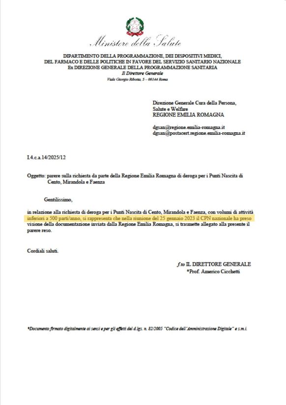 SOSPENSIONE “TEMPORANEA” DEL PUNTO NASCITA DI MIRANDOLA, DOMANDA DI DEROGA DELLA REGIONE E RISPOSTA DEL MINISTERO DELLA SALUTE .