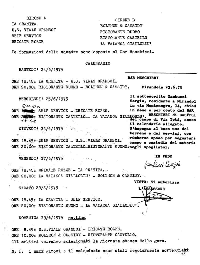 Anche il “Lolli”, naturalmente, ospitò, oltre alle partite della Mirandolese, altri vari eventi. Nel periodo primavera-estate del 1975, del 1976, e del 1977, fu teatro infatti del Torneo delle Aziende di Mirandola (denominato Coppa 1° Maggio, con trofeo destinato alla compagine vincitrice offerto dall’Amministrazione Comunale mirandolese), organizzato dalla Camera del Lavoro di Mirandola e dal Gruppo Sportivo Organizzazioni Sindacali C.G.I.L., C.I.S.L. ed U.I.L., zona Bassa Modenese, ma anche di incontri amichevoli tra gruppi sportivi cittadini, tornei delle compagnie, dei caffè e dei rioni di Mirandola. Il più importante impianto calcistico cittadino venne anche richiesto, sempre per la disputa di partite amichevoli, dall’associazione C.B. Elettra, di Mirandola (in occasione dei confronti contro l’associazione C.B. 27, di Verona), dal Tennis Club Mirandola, ed ospitò, nel novembre del 1976, l’incontro amichevole tra Mirandolese e Carpi (con incasso interamente devoluto alle popolazioni duramente colpite dal terremoto in Friuli, avvenuto nel maggio dello stesso anno), nel maggio del 1977 una manifestazione nazionale di pattinaggio artistico, nell’aprile del 1978 la sfida tra le rappresentative giovanili dei Comitati di Finale Emilia e di Mantova, nel maggio del 1979 (in occasione della 175A edizione della Fiera di Mirandola) il 1° Torneo Notturno di calcio, riservato alla categoria Esordienti, ed aperto a tutte le società dilettantistiche della provincia di Modena, e delle province limitrofe, organizzato dai dirigenti del settore giovanile gialloblu. Da ricordare anche, nel giugno del 1975, la partecipazione di una formazione calcistica mirandolese, in rappresentanza del Comune di Mirandola, ad un meeting calcistico in quel di Villejuif, il comune francese gemellato con la città dei Pico.Nel corso degli anni Settanta, da ricordare è certamente Giuseppe Meschieri, per tutti semplicemente “Toppi”; per tutto il decennio ha vestito con estrema professionalità ed irreprensibile zelo il ruolo del segnalinee, durante le gare interne ed esterne della Mirandolese (nelle categorie dilettantistiche i due segnalinee erano infatti semplicemente due addetti delle due società che si incontravano). Un autentico personaggio d’altri tempi, folkloristico ed inimitabile, che ha conquistato l’affetto spassionato di tutti gli sportivi mirandolesi.
