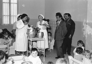 Di recente ho visto in rete una vecchia foto risalente alla fine degli anni ’40, dove viene ripreso mentre, probabilmente parte di una delegazione, visita l’asilo nido di viale della Libertà (ex ONMI) durante la distribuzione dei pasti,in secondo piano, nella sua tuta da lavoro.