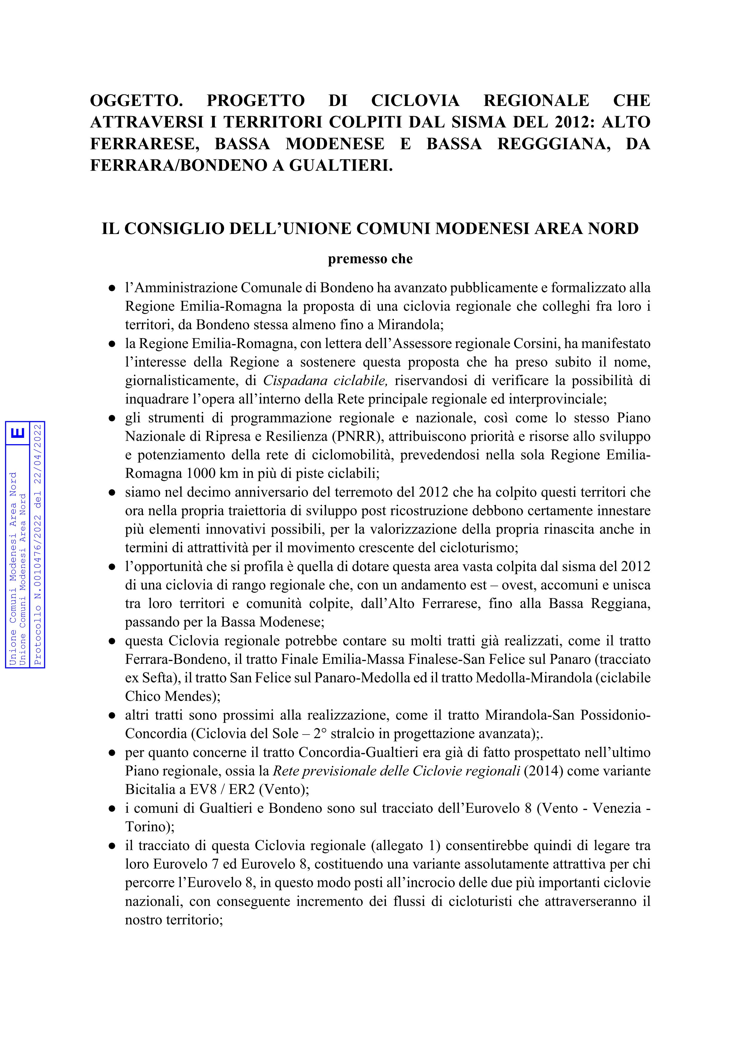 Nell’approssimarsi del decimo anniversario del sisma, il Gruppo Liste Civiche PD Bassa Modenese lancia il progetto di una ciclovia di rango regionale che colleghi i territori e le comunità colpite dal sisma del 2012, dall’Alto Ferrarese (Bondeno e Ferrara stessa), alla Bassa Reggiana (Gualtieri e Brescello), passando per la Bassa Modenese. 100 km di ciclovia (in allegato il tracciato) che costituirebbero anche una attrattiva connessione fra Ciclovia del Sole e l’altra grande ciclovia europea, l’Eurovelo 8 – Vento che percorre il Po. La mozione che articola questa proposta (in allegato), a firma del capogruppo Paolo Negro, insieme ai consiglieri Andrea Ratti e Margherita Novi, è stata approvata all’unanimità nel corso della seduta del Consiglio dell’Unione dei Comuni Modenesi Area Nord, tenutasi ieri sera.
