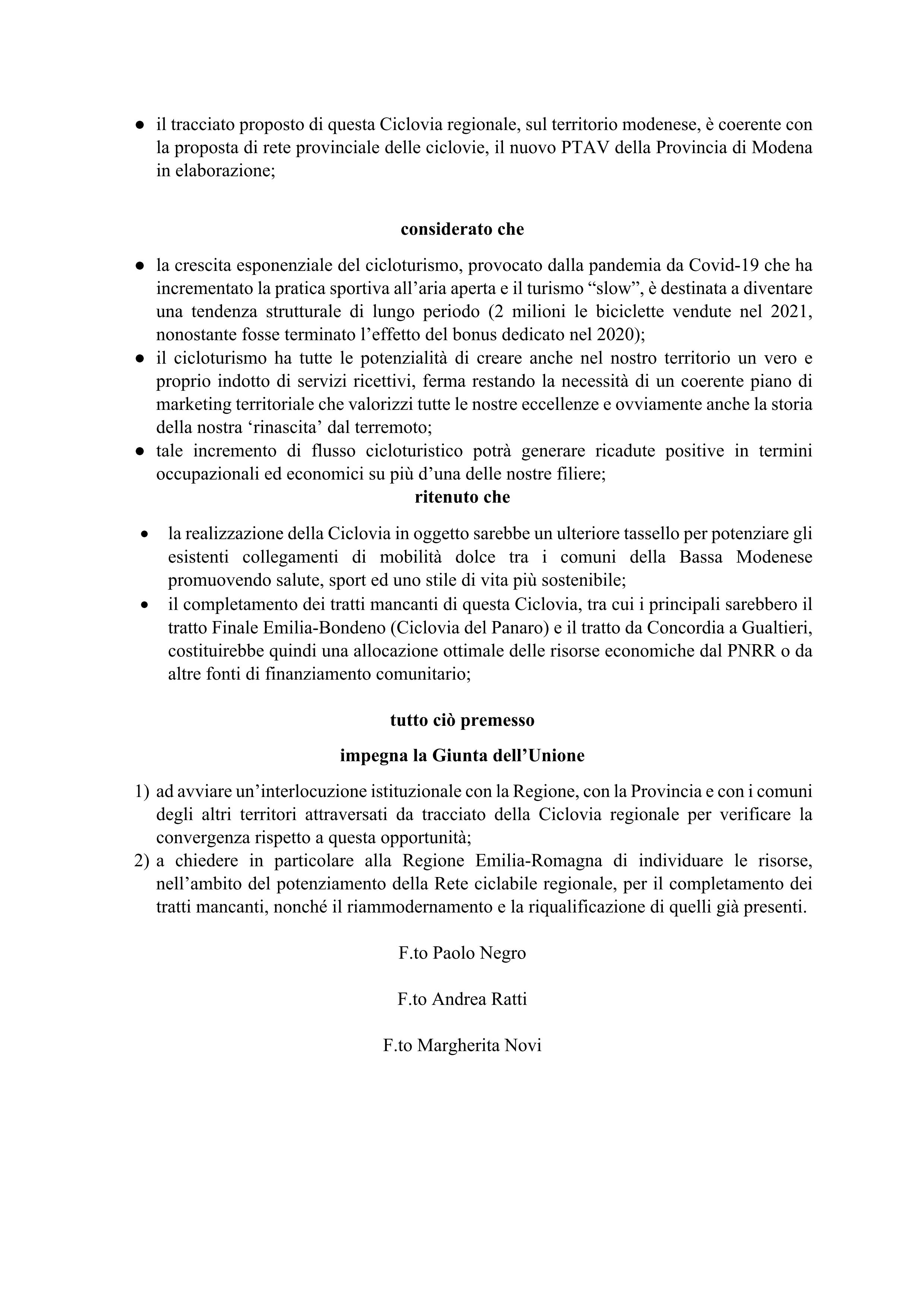 “Nei mesi scorsi si è aperto un dibattito circa il collegamento fra l’Eurovelo 8 Vento sul Po e la nostra Ciclovia del Sole, un collegamento da Bondeno a Mirandola – spiega il capogruppo Paolo Negro – Il progetto può e deve essere più ambizioso: dotare tutta l’area vasta a sud del Po, colpita dal sisma del 2012, di una ciclovia di rango regionale che, con un andamento est – ovest, accomuni e unisca tra loro territori e comunità colpite, dall’Alto Ferrarese, fino alla Bassa Reggiana, passando per la Bassa Modenese. Questa Ciclovia regionale potrebbe contare su molti tratti già realizzati o in fase di realizzazione, come il tratto Ferrara-Bondeno, il tratto Finale Emilia-Massa Finalese-San Felice sul Panaro, lungo l’ex Sefta, il tratto della Ciclovia del Sole da San Felice a Concordia. I tratti mancanti, da Concordia a Brescello e da Finale Emilia a Bondeno sono già previsti dalla pianificazione provinciale e regionale. Si tratta di raccordare e pianificare il tutto con la logica di un’unica ciclovia che abbracci questi territori per raccontarne la rinascita post terremoto, una ciclovia che costituirebbe una variante assolutamente attrattiva per chi percorre l’Eurovelo 8 e un raccordo eccellente fra questa e la Ciclovia del Sole. Valorizzando entrambe e soprattutto le eccellenze del nostro territorio e di tutta l’area vasta a sud del Po. Siamo nel decimo anniversario del terremoto del 2012 che ha colpito questi territori che ora nella propria traiettoria di sviluppo post ricostruzione debbono certamente innestare più elementi innovativi possibili, per la valorizzazione della propria rinascita anche in termini di attrattività per il movimento del cicloturismo che sta avendo una crescita esponenziale destinata a diventare strutturale”