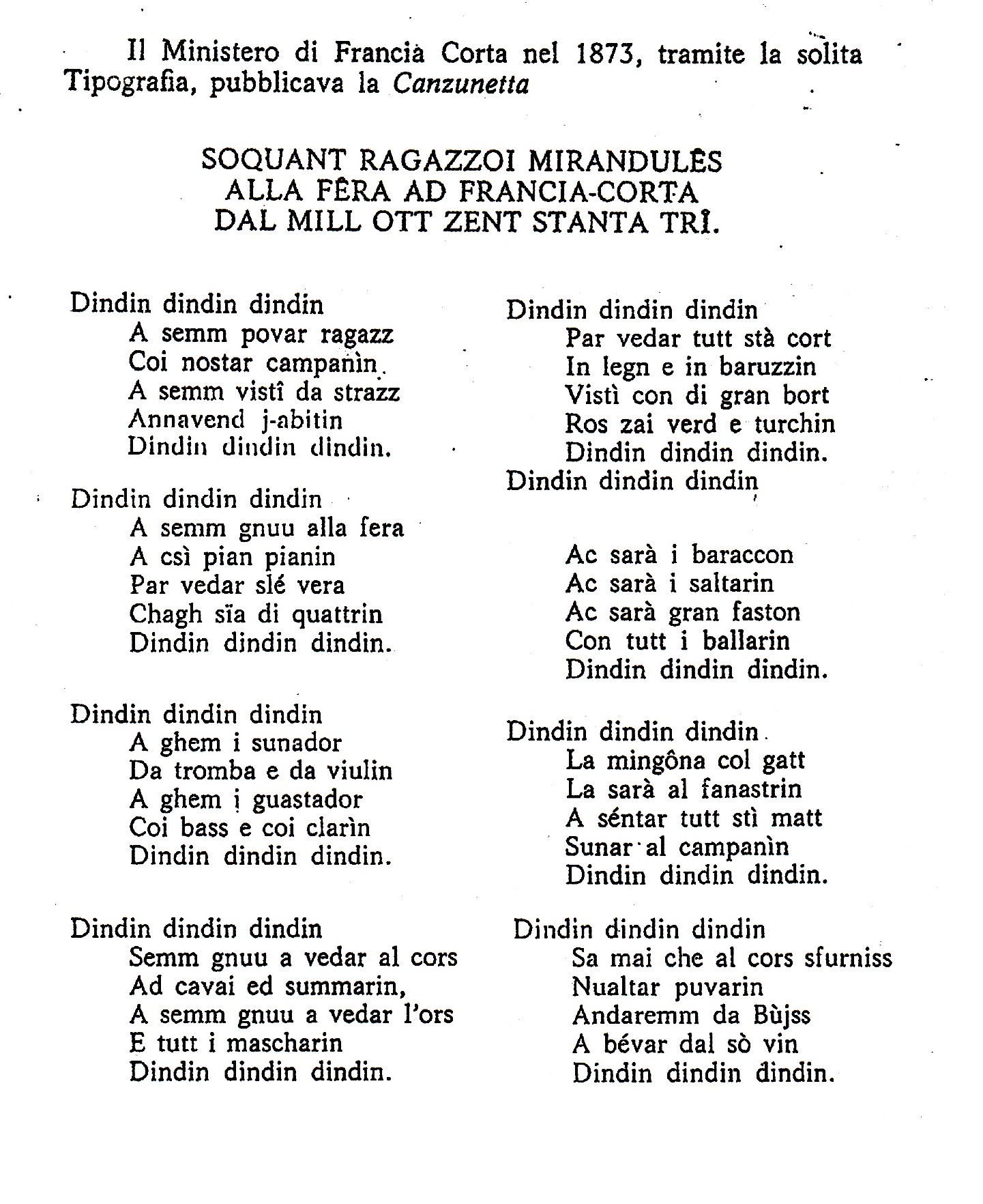 Un’altra novità assoluta viene segnalata nell’anno di grazia 1873, quando per la prima volta nella sua breve storia il Ministero di Francia Corta pubblica la consueta “canzonetta”, però in dialetto mirandolese, con il titolo “Soquant ragazzoi mirandules a la fera ad Francia Corta dal 1873”.