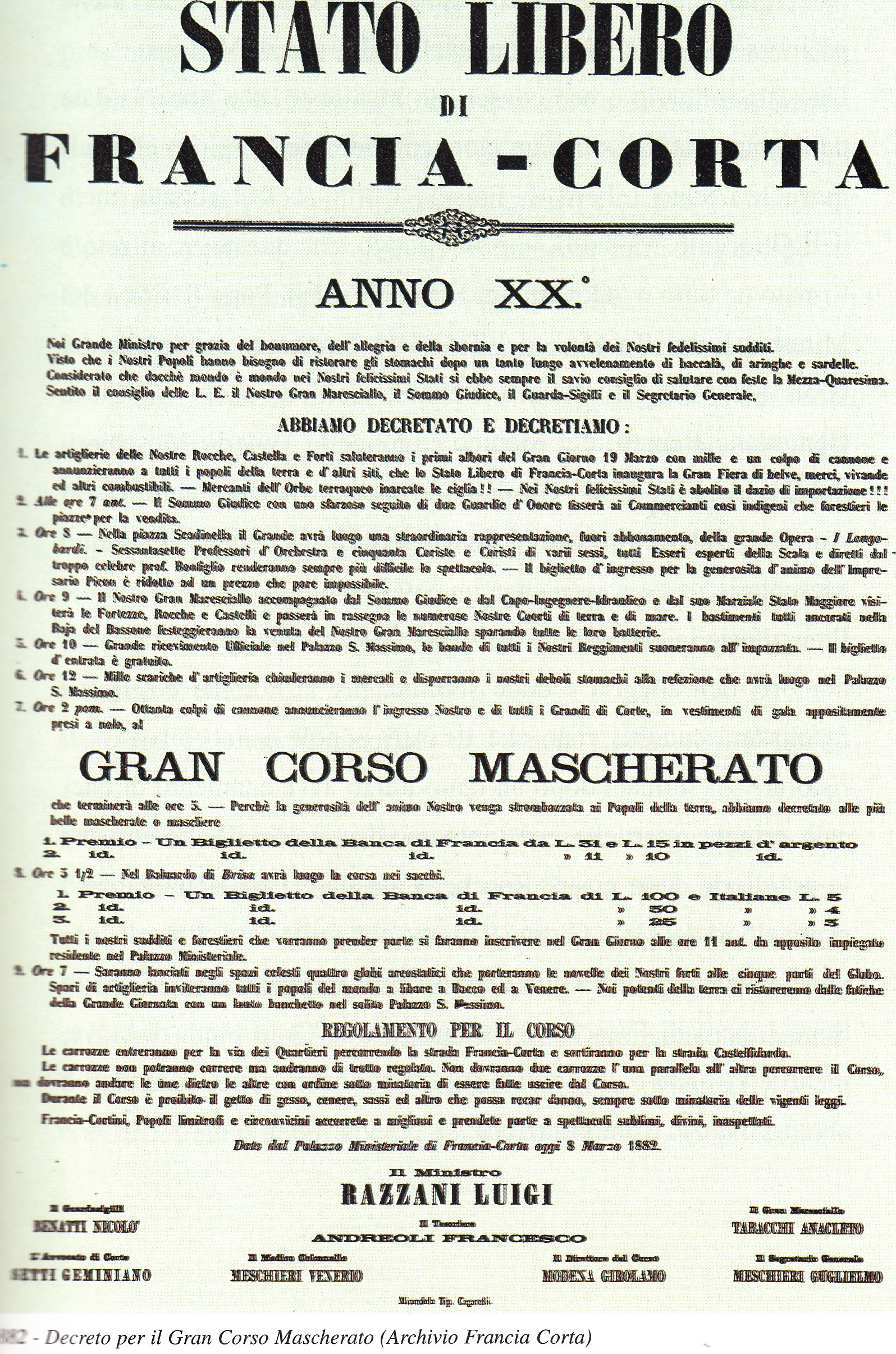 Uno straordinario e ben conservato manifesto, che porta la data dell’8 marzo 1882, offre un’eloquente idea dello spirito che animava lo “Stato Libero di Francia Corta” nella seconda metà dell’Ottocento. Va detto, in primo luogo, che questo manifesto è firmato da tutto il “Governo di Francia Corta”. Porta le firme del Ministro Luigi Razzani, del Tesoriere Francesco Andreoli, del Gran Guardasigilli Nicolò Benatti, dell’Avvocato di Corte Gemmano Benatti, del Medico Colonnello Venerio Meschieri, del Direttore dei Corsi Girolamo Modena, del Gran maresciallo Anacleto Tabacchi e infine del Segretario Generale Guglielmo Meschieri.