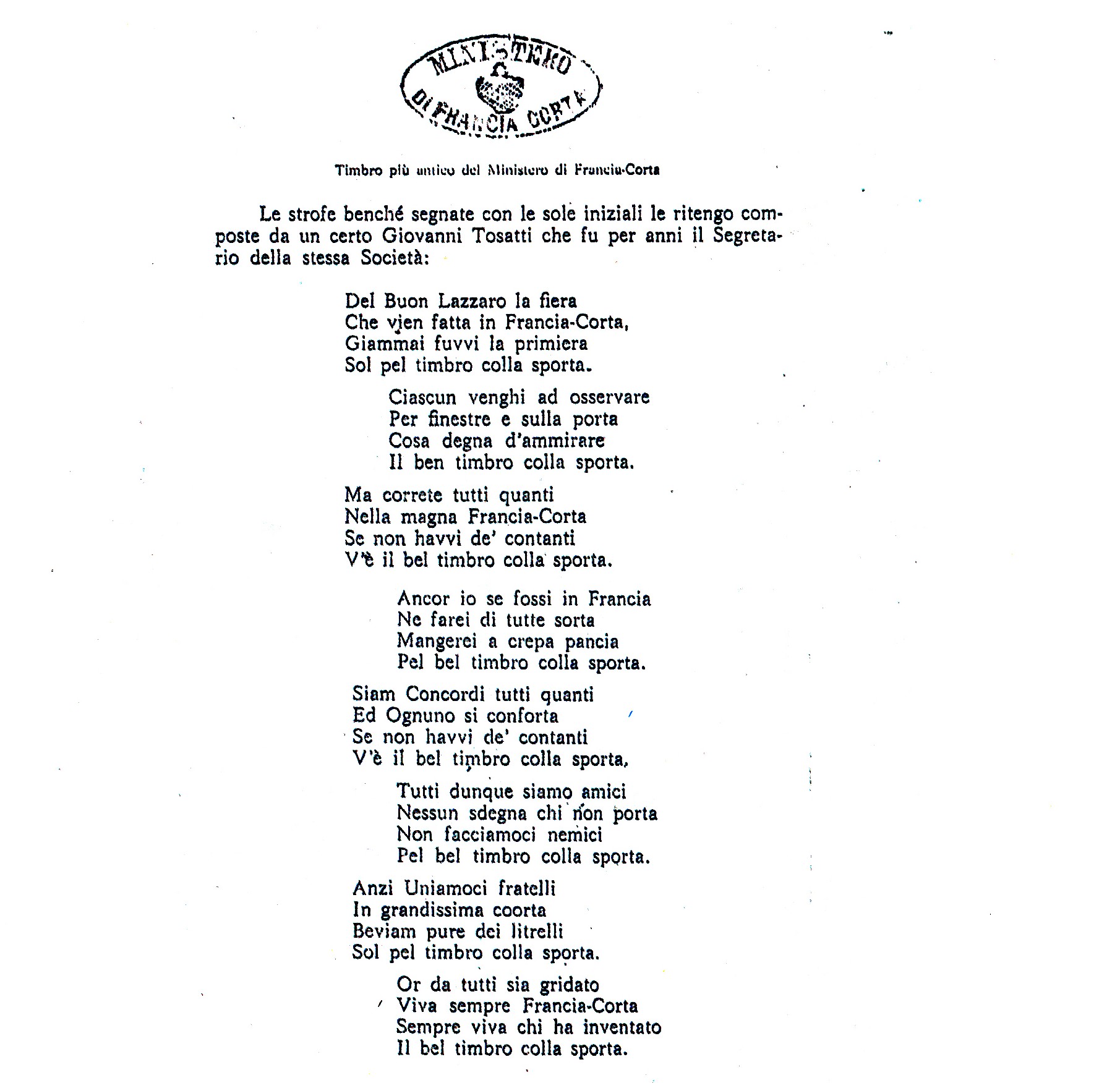 La prima “laude” in onore del timbro e della bandiera risale al 12 maggio 1863 e don Francesco Gavioli la attribuisce ad un certo Giovanni Tosatti, che per parecchi anni fu il segretario della Società di Francia Corta.