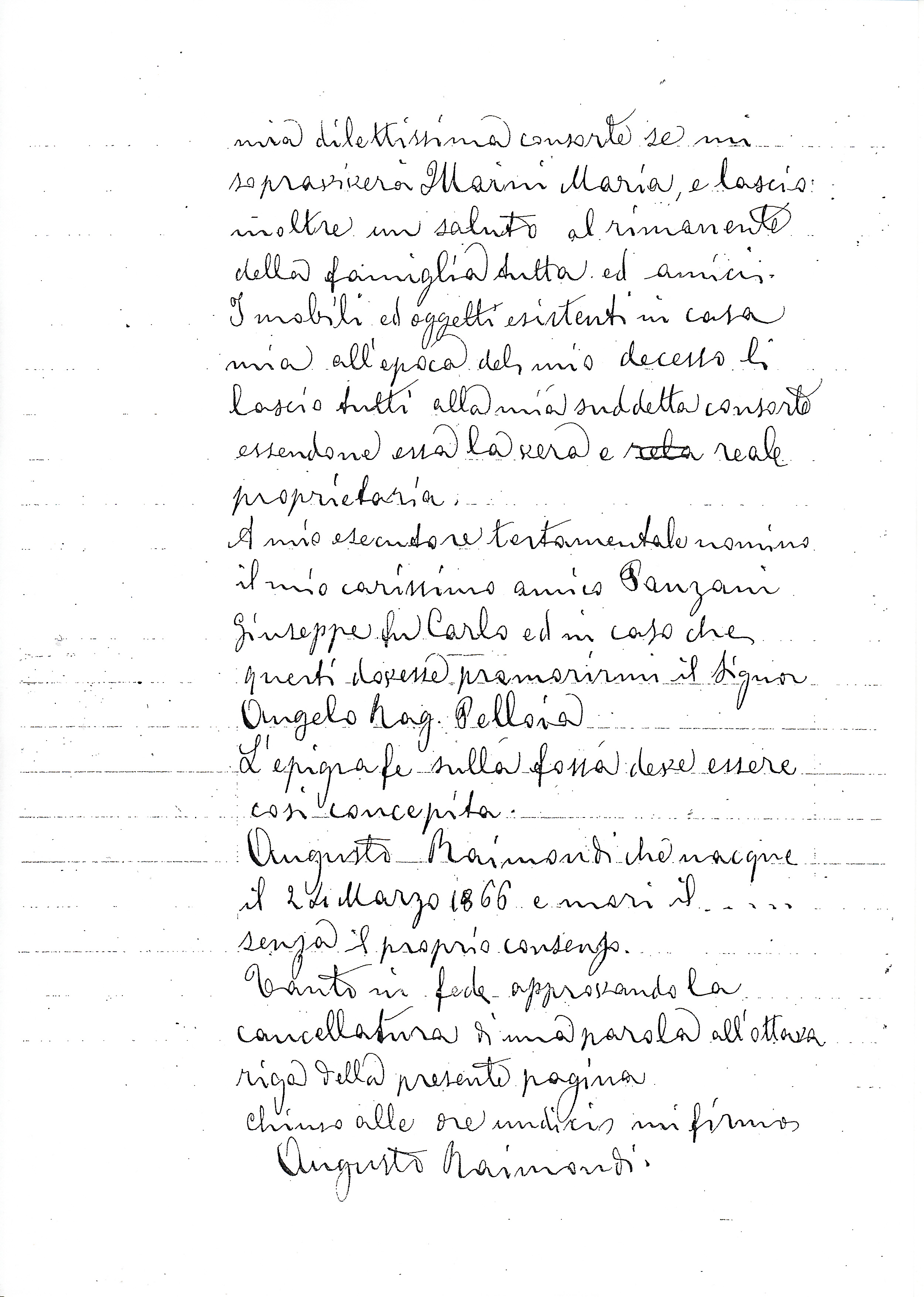 A mio esecutore testa mentale nomino il mio carissimo amico Panzani Giuseppe fu Carlo ed, in caso che questi dovesse premorirmi, il Signor Angelo Rag. Pelloia.