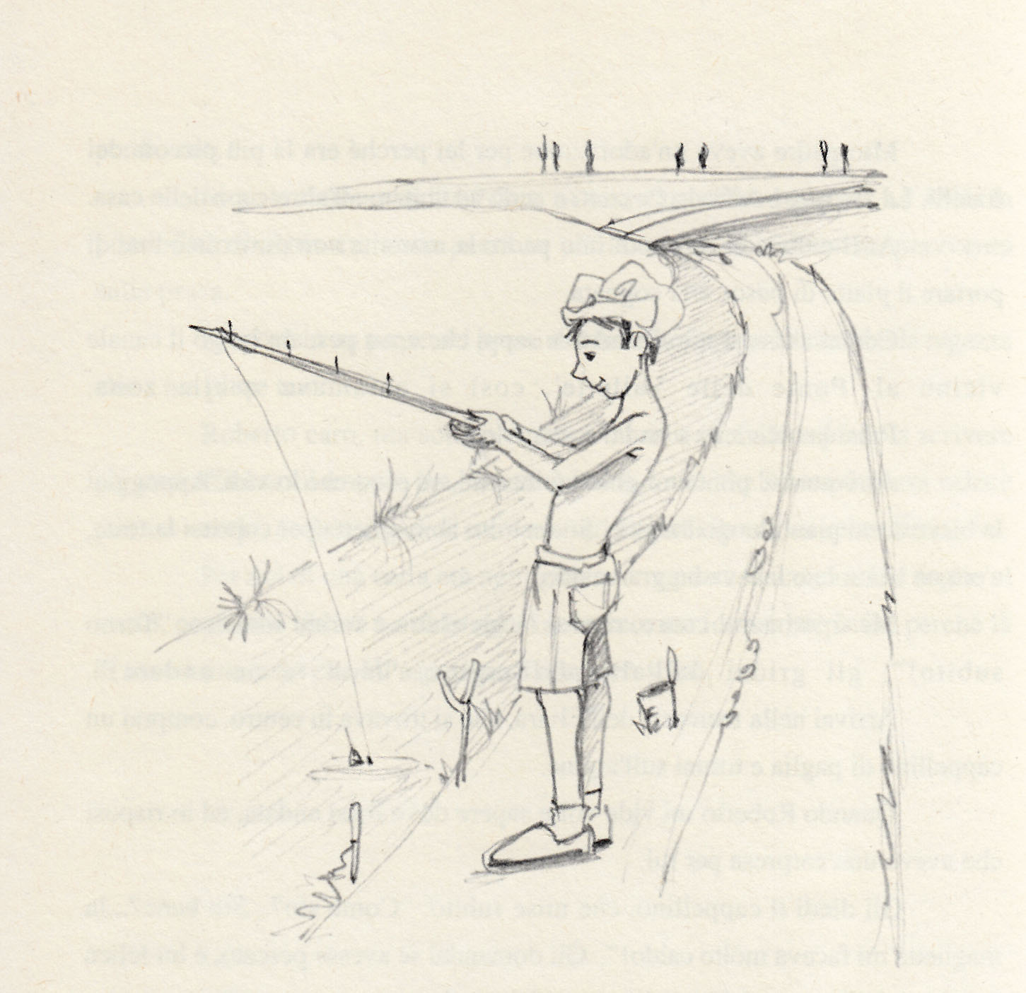 Gli diedi il cappellino, che mise subito: “Come sto?…Sto bene?…la maglietta mi faceva molto caldo!”. Gli domandai se avesse pescato, e lui felice tirò fuori dall’acqua un filo di ferro con dei pescigatto, saranno stati sette o otto.
