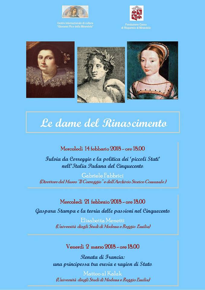 Si concluderà venerdì 2 marzo, alle ore 18, presso il Foyer del Teatro Nuovo, il ciclo di conferenze proposte dal Centro internazionale di Cultura “Giovanni Pico” (col patrocinio del Comune) sulle Dame del Rinascimento. L’ultimo appuntamento riguarda Renata di Francia (1510-1575), secondogenita di Luigi XII e di Anna di Bretagna, che sposò nel 1528 Ercole II d’Este, diventando così Duchessa di Ferrara. Parlerà di questa Dama Matteo Al Kalak, docente di Storia medievale e moderna dell’Università di Modena e Reggio e socio sostenitore del Centro “Giovanni Pico”.