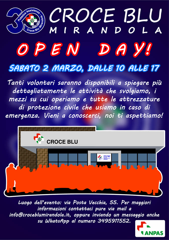 Sabato 2 marzo si svolgerà a Mirandola dalle 10 alle 17 l’open day della Croce Blu, presso la sede dell’associazione in via Posta Vecchia, 55. L’iniziativa, organizzata in occasione dei trent’anni della fondazione della Croce Blu mirandolese, si propone di fare conoscere ai cittadini attività e attrezzature dell’associazione. L’iniziativa ha il patrocinio del Comune di Mirandola. Per maggiori informazioni: e-mail info@croceblumirandola.it oppure inviare un messaggio su WhatsApp al numero 349/5911552.