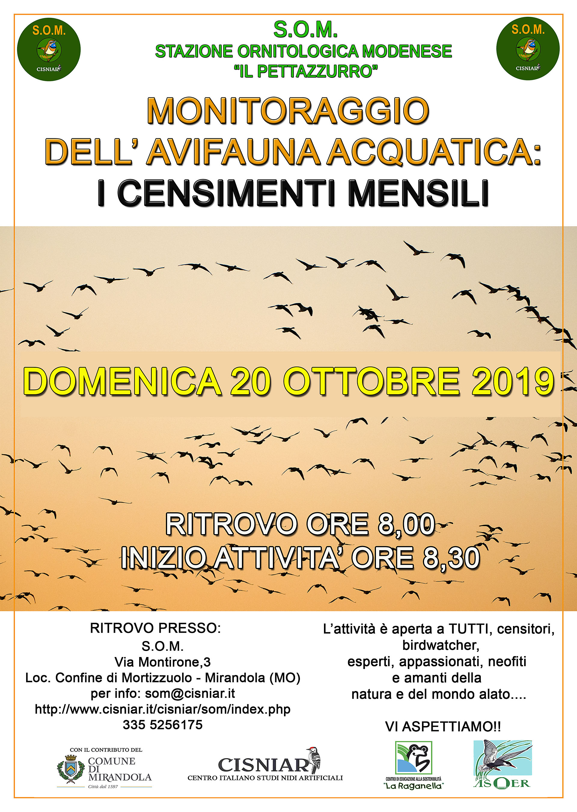 Si terranno  Domenica 20 OTTOBRE 2019 i Censimenti mensili degli uccelli acquatici e dei rapaci nella bassa modenese, ritrovo ore 08:00 presso la S.O.M.(Stazione Ornitologica Modenese) “il Pettazzurro” Loc. Confine di Mortizzuolo, Mirandola (MO), Via Montirone n° 3