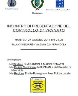 Un incontro per presentare il controllo di vicinato. L’iniziativa si svolgerà a Mirandola martedì 27 giugno, alle 21, presso la sala consiliare del municipio di via Giolitti.