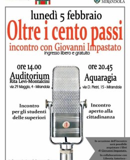 “Oltre i cento passi” è il titolo del doppio incontro con Giovanni Impastato, fratello di Peppino, l’attivista ucciso dalla mafia nel 1978 a Cinisi, in provincia di Palermo, che si svolgerà lunedì 5 febbraio a Mirandola. Alle ore 14 in aula magna “Montalcini” (via 29 Maggio, 4) Impastato incontrerà gli studenti delle scuole superiori; alle [...]