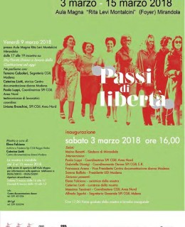 Sabato 3 marzo alle ore 16 inaugurerà, nel foyer dell’aula magna “Rita levi Montalcini”, la mostra “Passi di libertà”, promossa dal Coordinamento donne Spi-Cgil Regione Emilia Romagna, dal Centro documentazione donna e dal Comune di Mirandola, in occasione delle celebrazioni del 70esimo anniversario della Costituzione. Dopo i saluti di un rappresentante dell’Amministrazione comunale di Mirandola, [...]