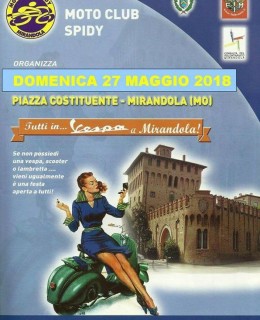 Nella giornata di domenica 27 maggio si svolgerà “Tutti in Vespa a Mirandola”, raduno nazionale a cura del Moto Club Spidy col patrocinio del Comune di Mirandola. Alle 8.30 ritrovo in piazza Costituente a Mirandola per iscrizioni con gadget e colazione. Ore 10.45 partenza per il giro turistico in direzione di Sermide (Mn), dove ci [...]