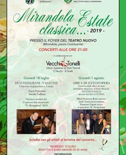 Concerto di arie e duetti d'opera al foyer del Teatro Nuovo Giovedì 1 agosto alle ore 21.00 si terrà l'ultimo appuntamento di "Mirandola classica... Estate 2019", presso il foyer del Teatro Nuovo, in Piazza Costituente, a Mirandola. L'iniziativa consisterà in un concerto di arie e duetti d'opera a cura degli allievi di canto dell'Istituto Superiore [...]