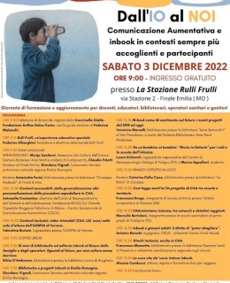 Dall’ IO al NOI: alla Stazione Rulli Frulli una giornata di aggiornamento su Comunicazione Aumentativa e inbook Il 3 dicembre, Giornata internazionale dei diritti delle persone con disabilità, si svolgerà a Finale Emilia, presso la Stazione Rulli Frulli, una giornata di formazione e aggiornamento sulla Comunicazione Aumentativa Alternativa (CAA) e sugli inbook. L’iniziativa è organizzata dal Sistema [...]