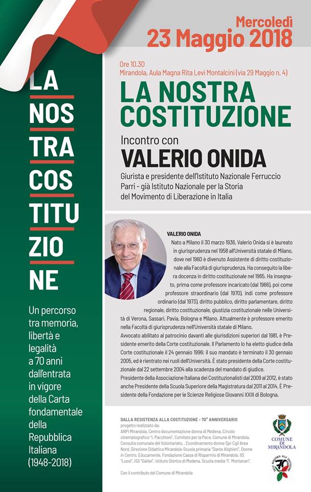 Nell’ambito delle iniziative organizzate per il 70esimo anniversario della Costituzione, Valerio Onida, giurista e presidente dell’Istituto nazionale “Ferruccio Parri”, sarà a Mirandola mercoledì 23 maggio alle ore 10.30 (aula magna Rita Levi Montalcini) per una conferenza su “La nostra Costituzione”.