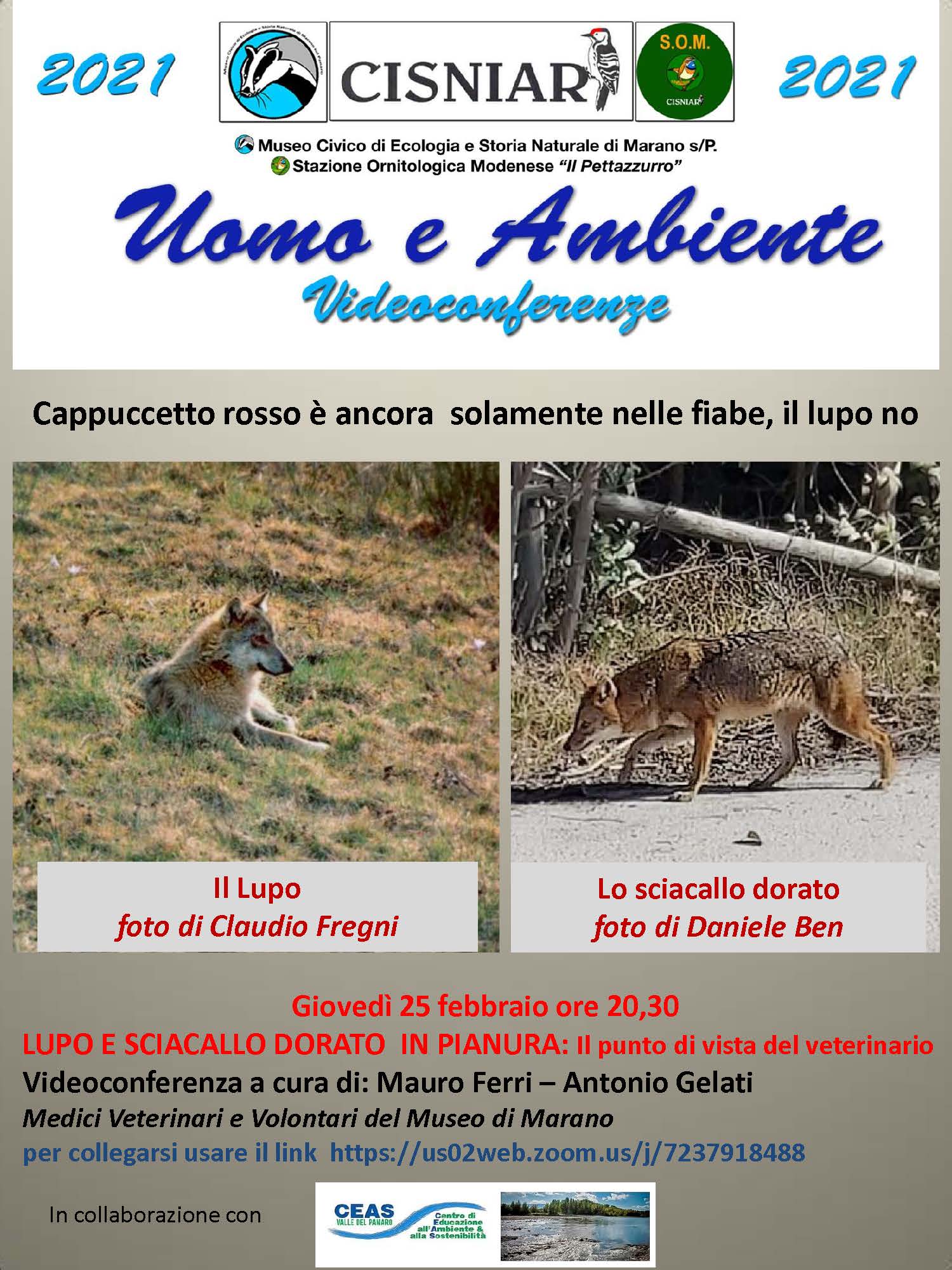 Il Museo di Ecologia e Storia Naturale di Marano sul Panaro organizza per Giovedì 25 FEBBRAIO ALLE ORE 20,30 la videoconferenza “LUPO E SCIACALLO DORATO IN PIANURA” a cura dei medici veterinari Mauro Ferri e Antonio Gelati