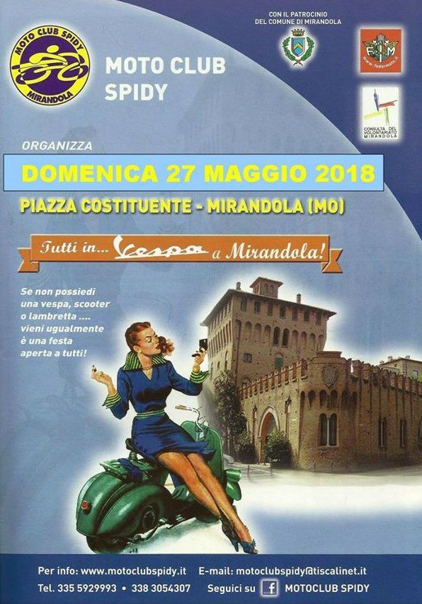 Nella giornata di domenica 27 maggio si svolgerà “Tutti in Vespa a Mirandola”, raduno nazionale a cura del Moto Club Spidy col patrocinio del Comune di Mirandola.