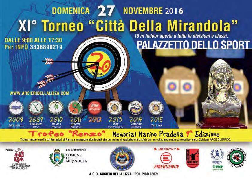 L’Asd Arcieri della Lizza-Polisportiva Pico festeggia i vent’anni di attività (1996-2016) organizzando l’undicesimo trofeo città di Mirandola che si svolgerà al Palazzetto dello sport mirandolese domenica 27 novembre dalle 9 alle 17.30, in collaborazione con il Comune. Il presidente Vilmo Gavioli invita tutti i soci sostenitori anche passati «a condividere con noi questo traguardo che serva a mantenere quella giusta “tensione” foriera di tanti buoni risultati futuri, senza dimenticarci di quelli ottenuti sia a livello agonistico di squadra e individuali che a livello organizzativo e promozionale di questo nobile sport. Ai soci che hanno contribuito e che contribuiranno alla diffusione del tiro con l’arco in tutte le sue espressioni anche ludiche rivolte ai giovanissimi e agonistiche va il mio grazie. Un grazie anche ai familiari di Renzo socio fondatore storico che anche quest’anno sono al nostro fianco nell’organizzazione della gara indoor al Palazzetto dello Sport giunta alla sua undicesima edizione (nona come “Memorial Renzo”)». Gavioli ringrazia anche la Polisportiva Pico alla quale gli Arcieri sono affiliati da vent’anni, Gemi Sport, il Comune di Mirandola, il Comune di Medolla, sede del campo estivo di allenamento sezione “Bosco Rosso”, la Fondazione Cassa di Risparmio di Mirandola, la Federazione italiana tiro con l’arco, il Comitato regionale emiliano romagnolo, i familiari degli atleti che li supportano e incoraggiano, dando anche una mano in Società.