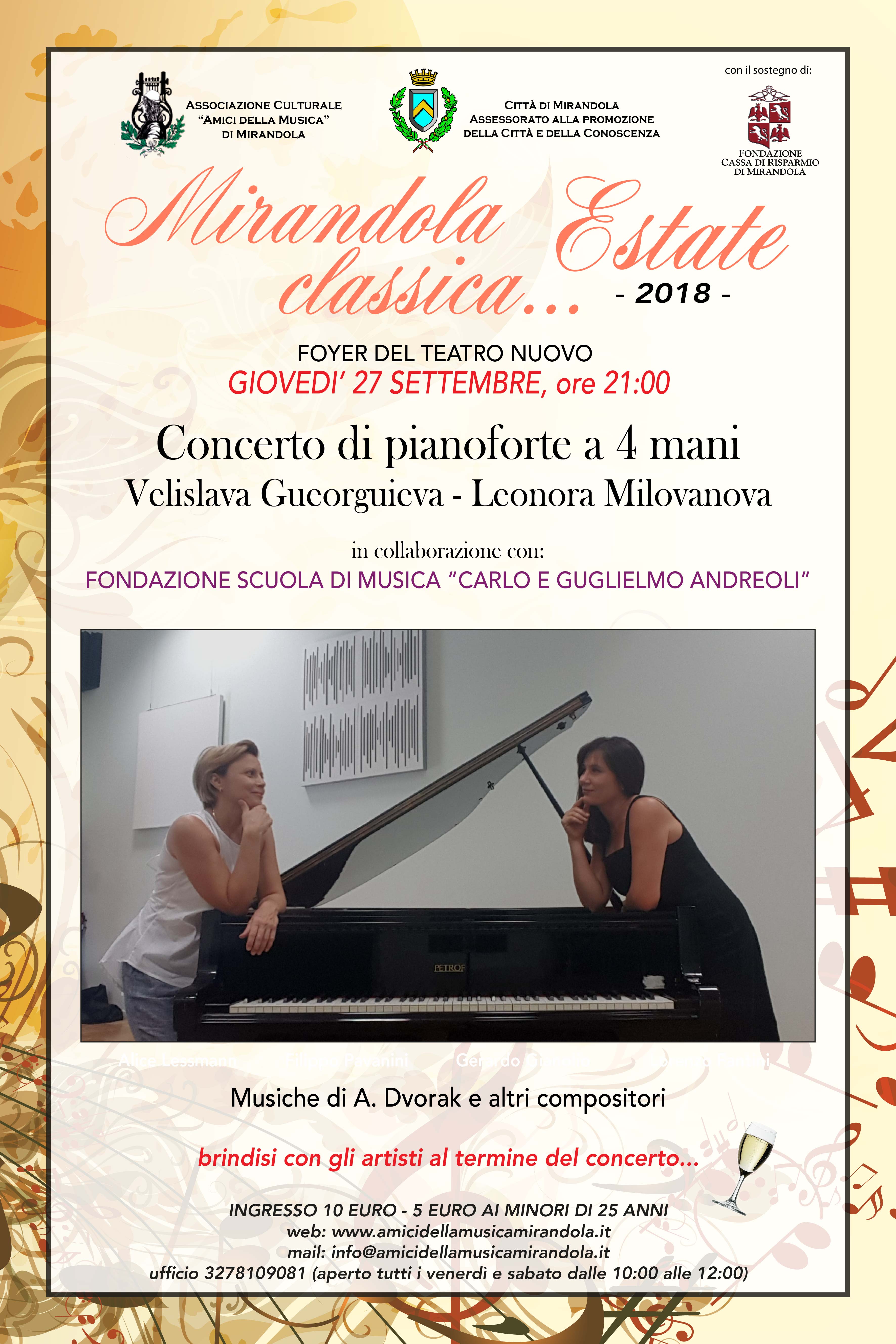 Giovedì 27 settembre alle ore 21 presso il Foyer del Teatro Nuovo, in piazza Costituente, gli “Amici della Musica” di Mirandola ospiteranno Velislava Gueorguieva e Leonora Milovanova in un concerto per pianoforte a quattro mani che segnerà l’ultimo appuntamento della stagione estiva di “Mirandola Classica”, svolto in collaborazione con la Fondazione Scuola di Musica “Carlo e Guglielmo Andreoli”.