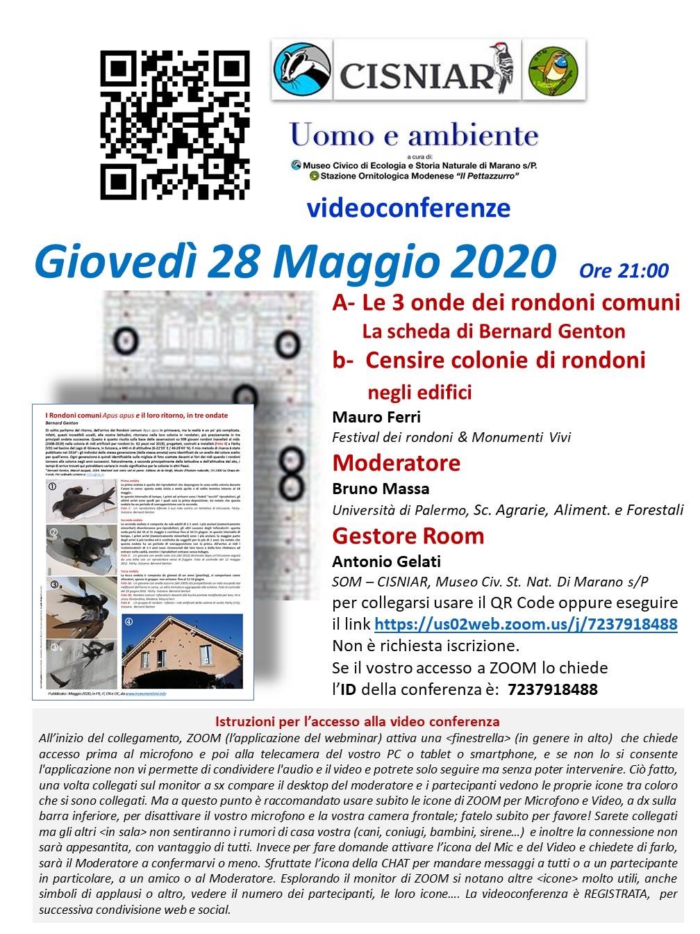 Continua il programma di videoconferenze,questa sera, GIOVEDì 28 MAGGIO ALLE ORE 21,00 su zoom. Il programma prevede un bellissimo intervento del Dott. Mauro Ferri che parlerà dei RONDONI E DI COME CENSIRE LE LORO COLONIE. Da non perdere!!!