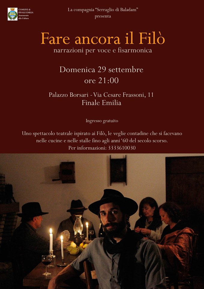 Domenica 29 settembre 2019, alle 21:00, nei saloni di Palazzo Borsari, a Finale Emilia, va in scena lo spettacolo “Fare ancora il Filò”, della Compagnia Serraglio di Baladam”, fondata dal regista mirandolese Pierre Campagnoli. L’ingresso è gratuito e, al termine dello spettacolo, è previsto un piccolo buffet offerto dal comune di Finale Emilia.