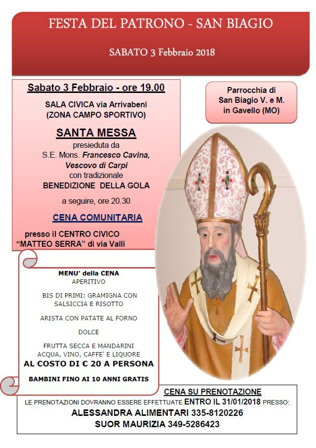 A questo risale il rito della “benedizione della gola”, compiuto con due candele incrociate. A San Biagio, con benedizione della gola. L’atto si collega a una tradizione secondo cui il vescovo Biagio avrebbe prodigiosamente