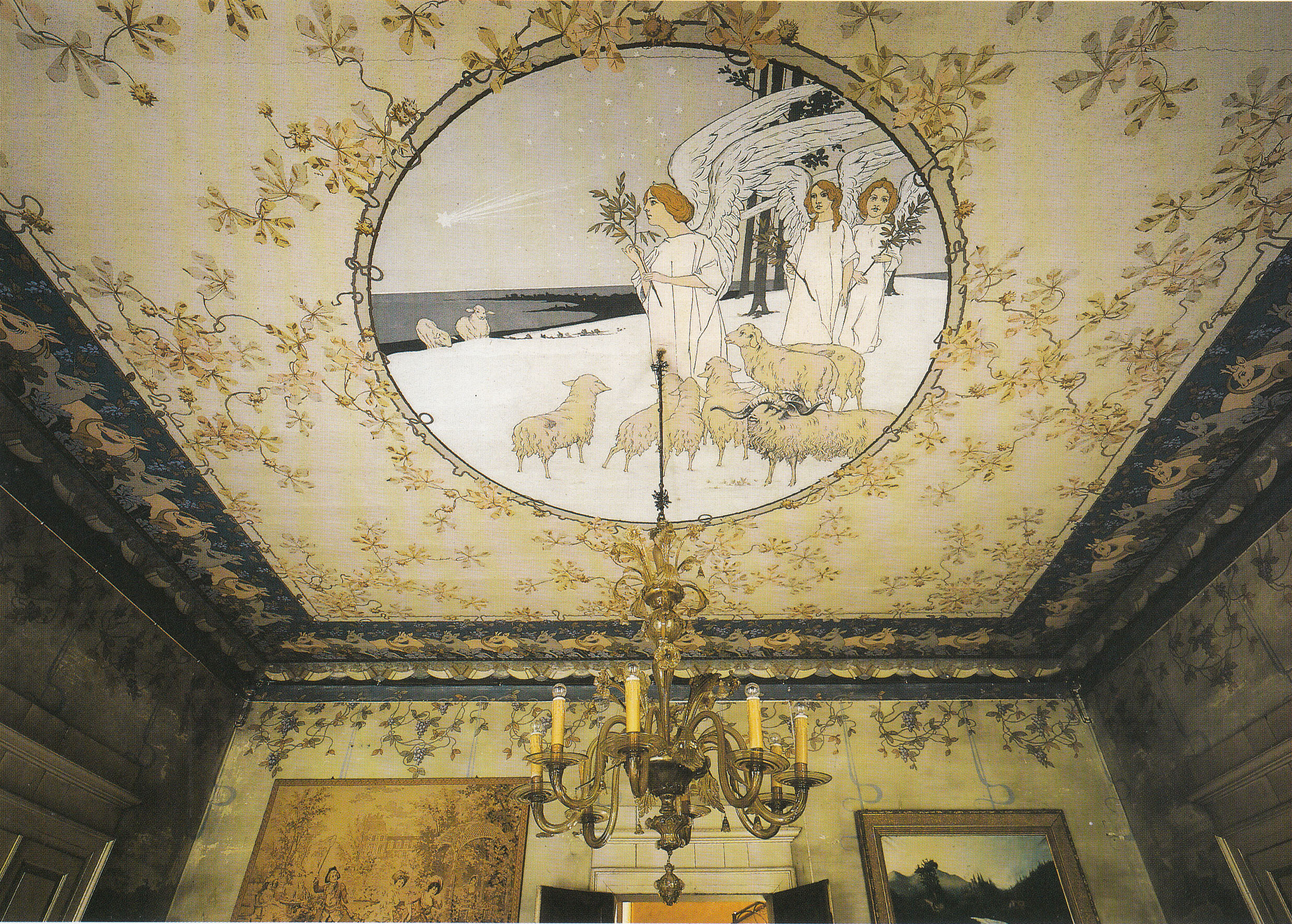 Nella sala centrale al piano terreno, su un soffitto neutro ornato dall’esile grafia delle foglie di ippocastano, si stagliano immagini inconsuete: nel grande medaglione una teoria di angeli preraffaelliti che sulla scia della stella segue un metaforico cammino di pace in un paesaggio di nordiche valenze; sulla fascia marcapiano campita in azzurro, un giro continuo di cerbiatti; lungo le pareti, tralci di glicini fioriti.