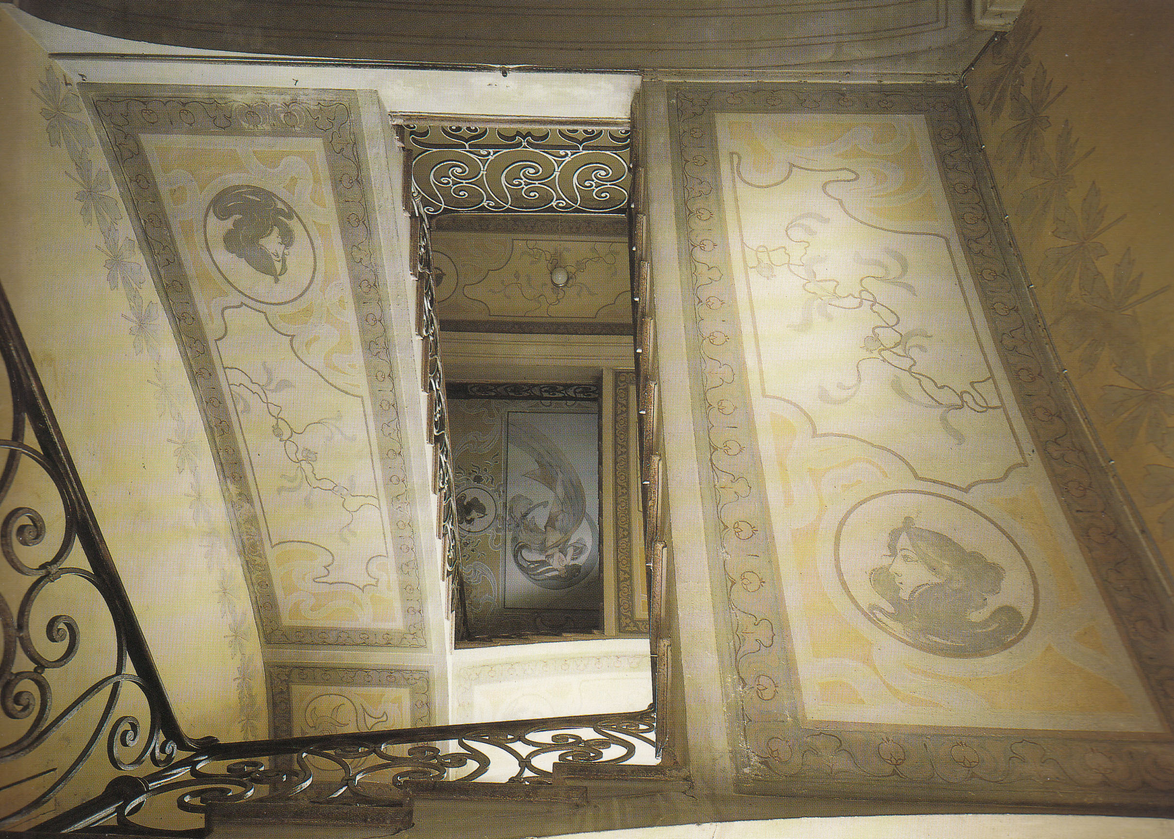 Nel vano scala, motivi vegetali stilizzati e a onde pausati da medaglioni dove il profilo femminile ricorrente rimanda verosimilmente alle sembianze dell’antica proprietaria, concludono in un plafond siglato dall’elegantissima cifra di un’immagine femminile alata.