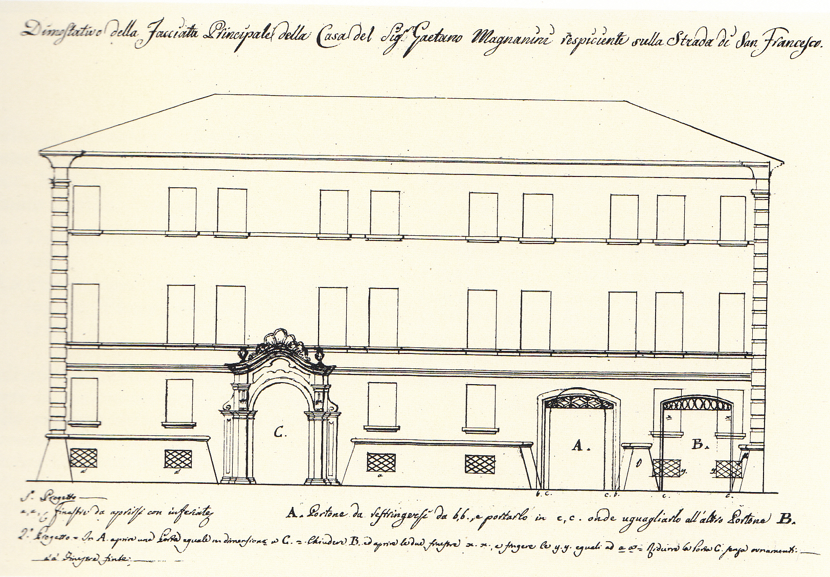 Progetto dimostrativo della facciata principale della casa del Sig. Gaetano Magnanini respicente sulla Strada di San Francesco (Mirandola, Centro Culturale Polivalente, Archivio Storico Comunale. Commissione Ornato – Anno 1837)