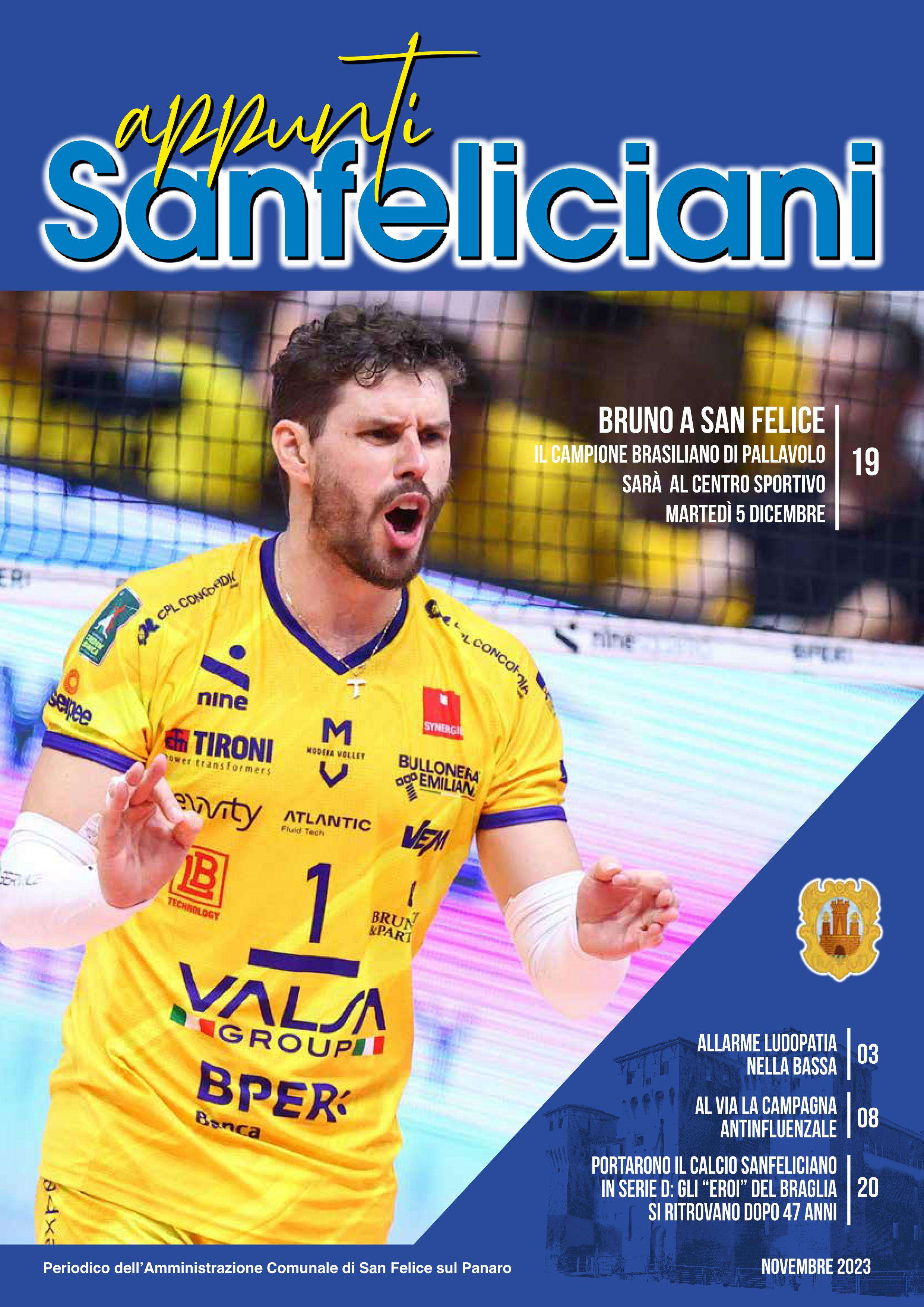 In questo numero viene presentato l’allarmante rapporto sulla ludopatia nella Bassa realizzato da Federconsumatori Modena, mentre per la sanità si parla della campagna antinfluenzale che ha preso il via nei giorni scorsi. La pagina sportiva si apre con Bruno Mossa De Rezende, capitano della nazionale brasiliana e di Modena Volley, che sarà ospite martedì 5 dicembre a San Felice, presso il centro sportivo di via Garibaldi, alle 19, per la presentazione della sua biografia “Dal buio all’oro”.