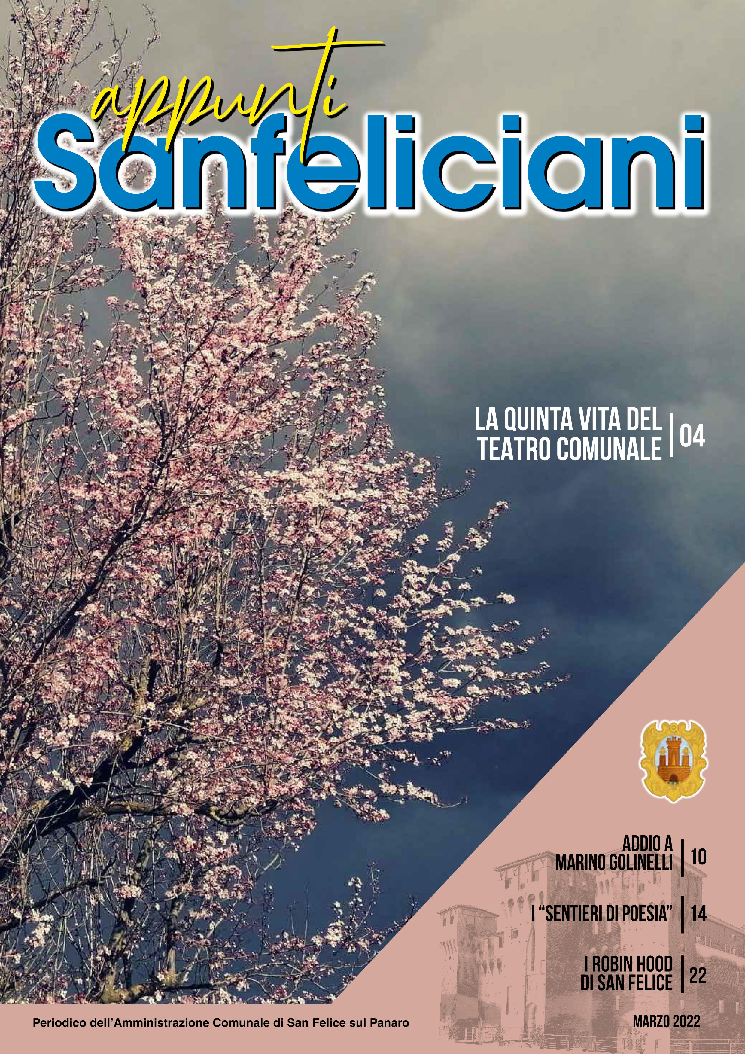 È in distribuzione il numero 3 di marzo 2022 di “Appunti Sanfeliciani”, il periodico mensile del Comune di San Felice sul Panaro. In questo numero troviamo, tra gli altri articoli, un ampio servizio sul Teatro Comunale, un commosso addio a Marino Golinelli, l’imprenditore filantropo originario di San Biagio, approfondimenti sull’associazione “Sentieri di Poesia” e sui campioni cittadini di tiro con l’arco. Il giornale può essere consultato on line, sul sito del Comune (www.comunesanfelice.net) e su quello del “Barnardon” (www.albarnardon.it).