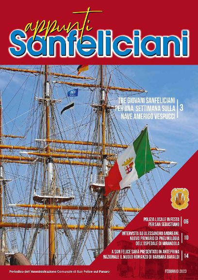 È in distribuzione il numero 2 di febbraio 2023 di “Appunti Sanfeliciani”, il periodico mensile del Comune di San Felice sul Panaro. In questo numero si parla della straordinaria opportunità concessa a tre giovani sanfeliciani di trascorrere una settimana sulla bellissima nave scuola della Marina Militare Italiana “Amerigo Vespucci”. Ci sono inoltre, tra i vari articoli, una intervista ad Alessandro Andreani, nuovo primario di Pneumologia dell’ospedale di Mirandola, e il bilancio del 2022 della polizia locale dell’Unione dei Comuni. Il giornale può essere consultato on line, sul sito del Comune (www.comunesanfelice.net) e su quello del “Barnardon” (www.albarnardon.it).
