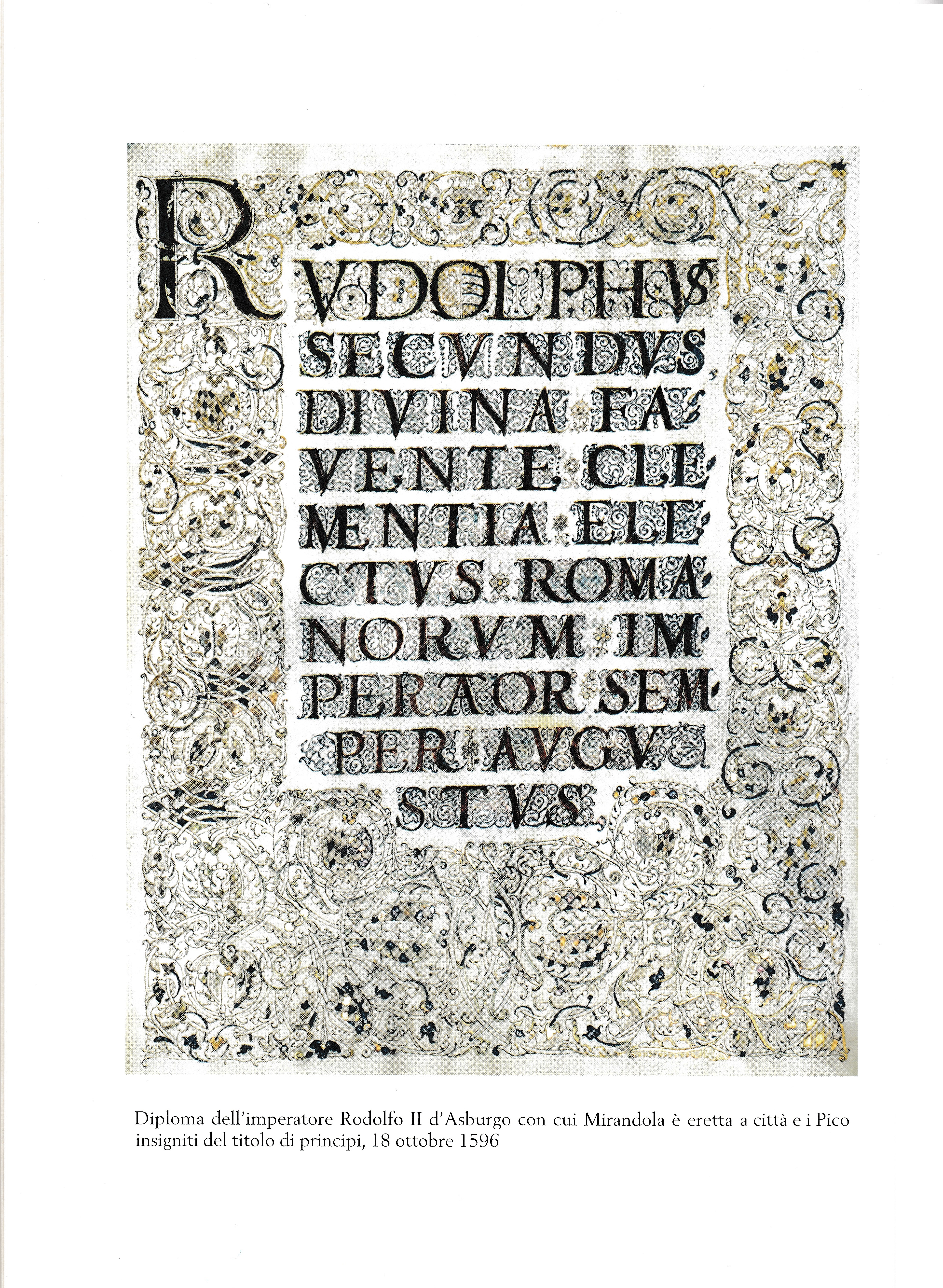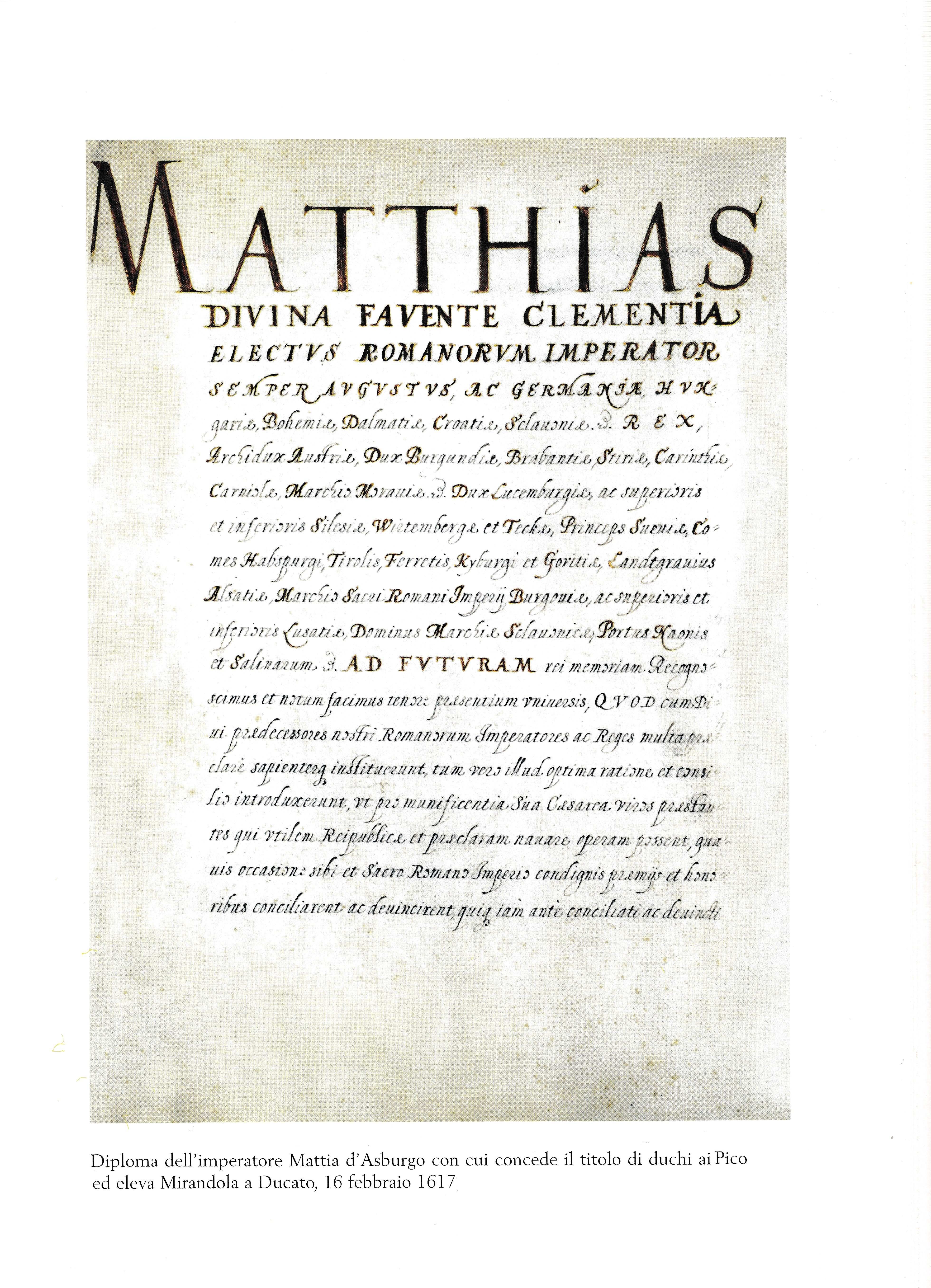 Mirandola è ormai una capitale ricca di chiese e conventi dei maggiori ordini religiosi, Cappuccini, Gesuiti, Agostiniani, Domenicani, Mendicanti, Scopetini, Serviti, Clarisse, degna dei maggiori riconoscimenti. Già nel 1596 Rodolfo II d’Asburgo l’aveva proclamata Città e elevato i Pico al titolo di Principi per riconoscenza al riallineamento della strategica fortezza all’Impero ma la costante attività politica di Alessandro I alla corte degli Asburgo riuscirà ad ottenere nel 1617 l’ambito titolo di Ducato e, dietro un esborso di 100.000 fiorini d’oro pari a 350 kg di oro zecchino, anche l’agognato riconoscimento del figlio naturale come legittimo erede alla Signoria.