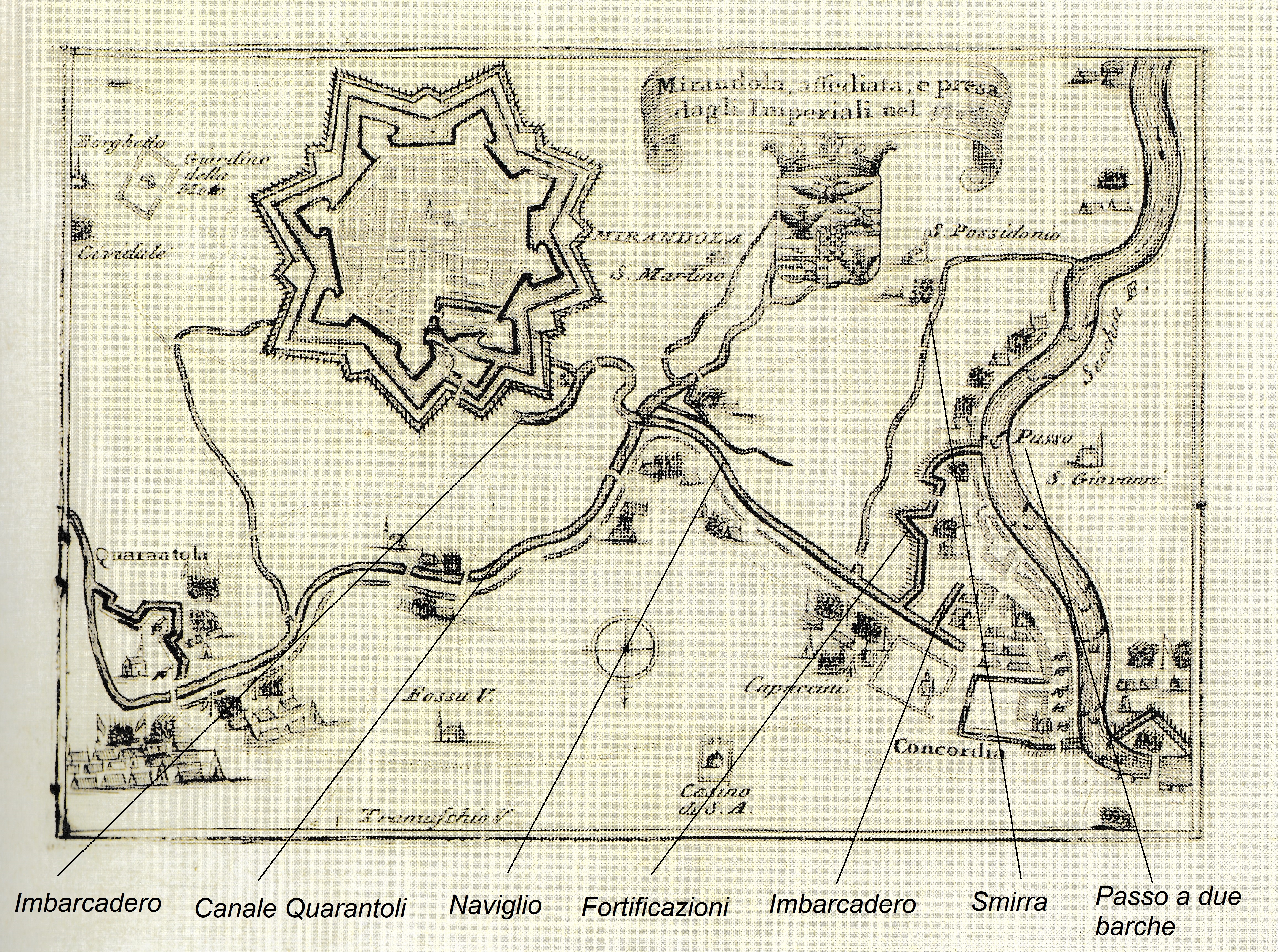Dal punto di imbarco di Mirandola presso il Rivellino, il baluardo esterno alle mura che difendeva la porta della città, si arrivava a Concordia, attrezzata con una banchina di sbarco e imbarco che si inoltrava nel paese perpendicolarmente al canale fin quasi al palazzo Corbelli. L’odierna via 1° Maggio nasce dal suo successivo interramento. Il livello del Secchia era troppo alto a Concordia per consentire un naviglio in diretta comunicazione con il fiume, dall’imbarcadero si trasbordava perciò al porto fluviale, all’altezza dell’attuale ponte per Novi.