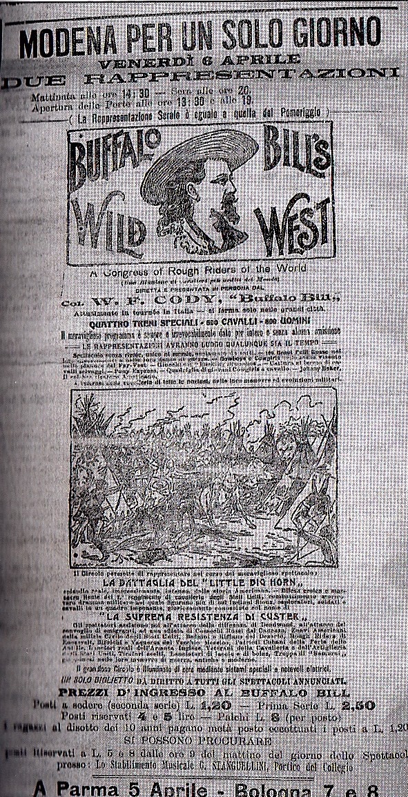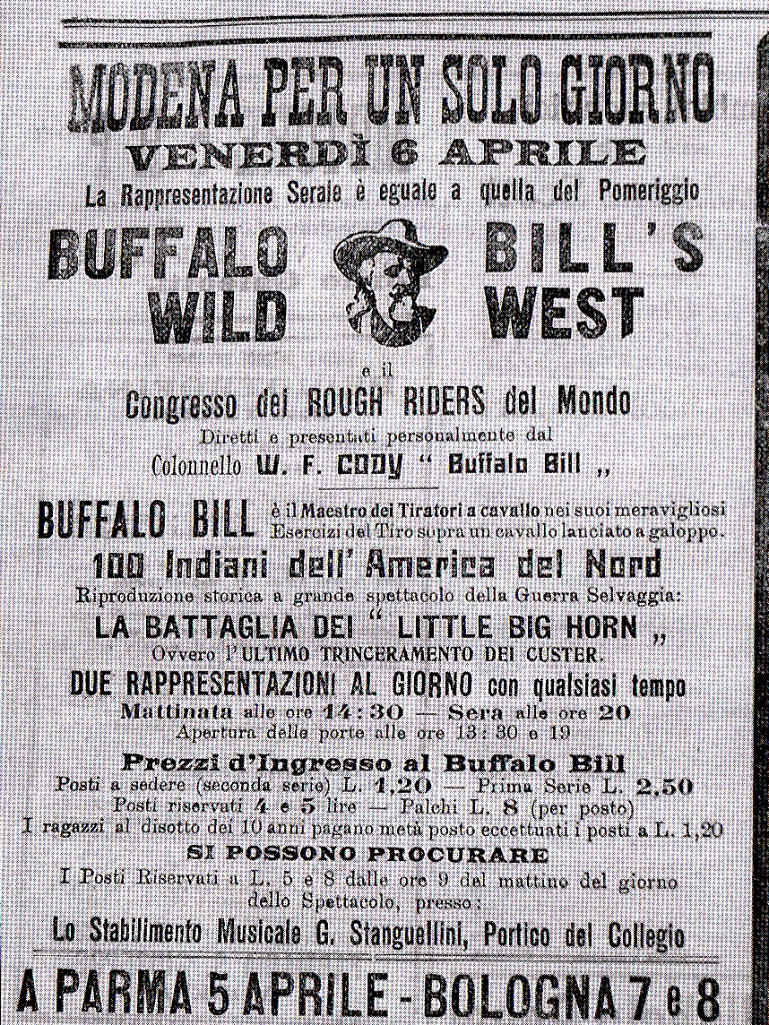 “Una vera americanata; geniale, piacevole, che ha anche il merito di durare due ore soltanto, ma che non risponde nella sostanza all’enorme aspettativa suscitata dalla fenomenale reclame”. Il giornale Il Panaro non fu particolarmente generoso con il Wild West, il grande spettacolo che Buffalo Bill portò a Modena il 6 aprile 1906. E non fu lusinghiero nemmeno il giudizio di un altro quotidiano, La Provincia di Modena: “Presi uno per uno, gli esercizi e gli esecutori non valgono quanto quelli che si vedono in dozzine di circhi equestri incomparabilmente più ricchi, più interessanti, più variati di questo di 120 o 150 cavalli (pochissimi belli), che fanno delle evoluzioni assolutamente comuni, con dei costumi meno che mediocri”.