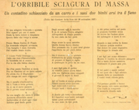 Negli anni 1913 e 1927 due gravi episodi (un omicidio e la tragica morte di vari componenti di una stessa famiglia) sconvolsero Massa Finalese. Questi fatti di cronaca ebbero una forte risonanza all’interno del mondo popolare ed ispirarono ai cantastorie la realizzazione di due «reportages» in versi e musica, permeati di intensa commozione. Riportiamo questi documenti nella loro stesura originale, eliminando tuttavia i cognomi dei protagonisti delle vicende.