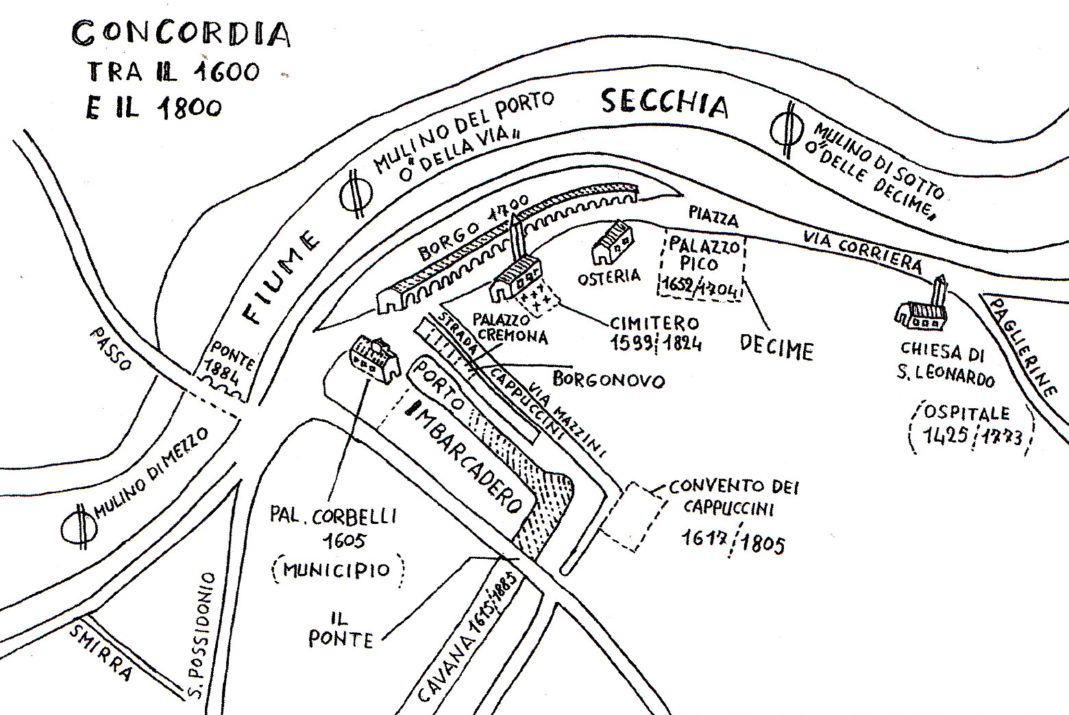 Con l’escavazione del naviglio e del porto, che arrivava viciniore al palazzo Corbelli, attuale sede municipale e quindi prossimo al carico e scarico delle merci e dei cereali da macinare negli attigui mulini “Delle decime” o mulino di sotto e del “Mulino del porto”, Concordia ebbe uno notevole sviluppo economico ed urbanistico.