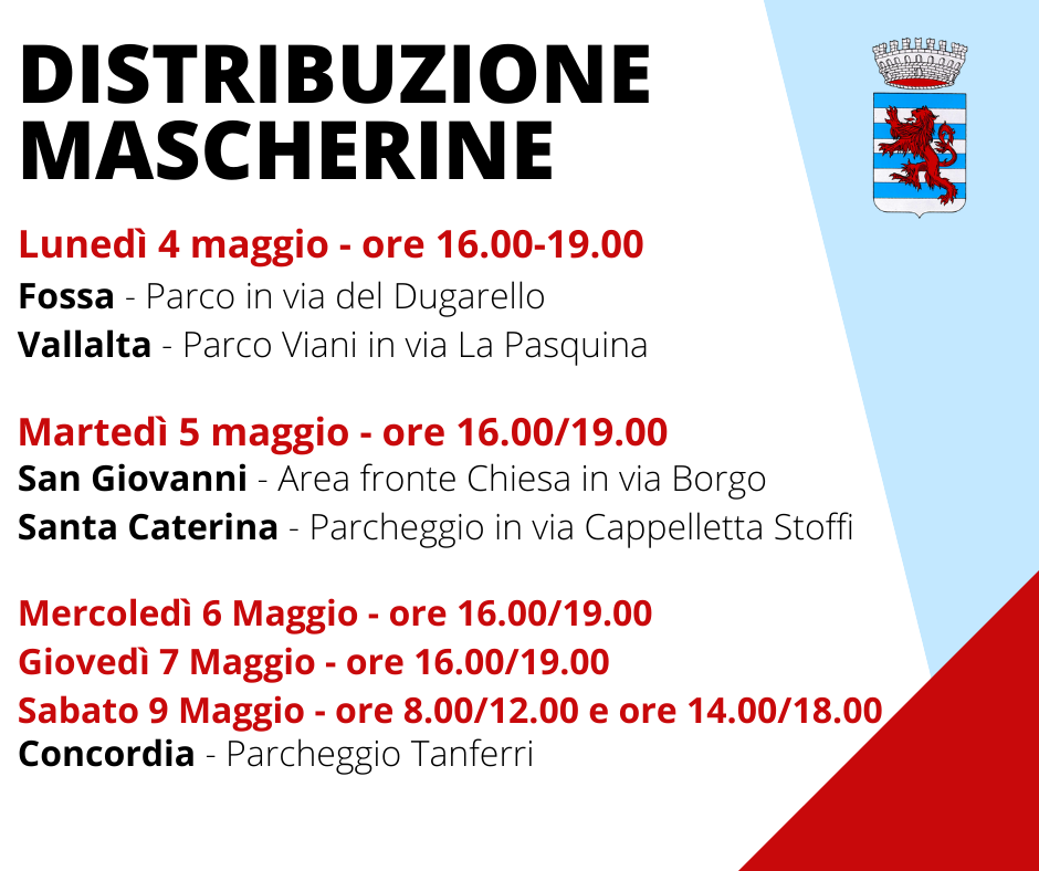 Le mascherine, opportunamente e correttamente imbustate, verranno distribuite dal Gruppo Comunale Volontari di Protezione Civile attraverso gazebo allestiti a Concordia e nelle frazioni.