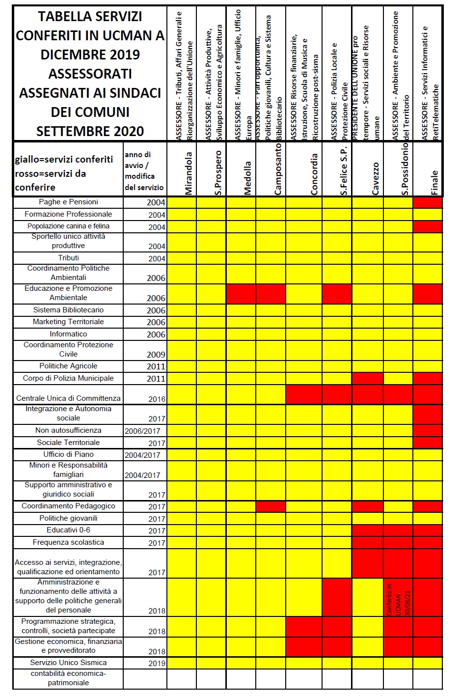 CONSIDERAZIONI SUL CONFERIMENTO DEI SERVIZI RAGGIUNTO DA UCMAN E SULLO STATO DELL’UNIONE, GUARDANDO LA TABELLA DEI SERVIZI CONFERITI IN UCMAN A DICEMBRE 2019. ASSESSORATI UCMAN.