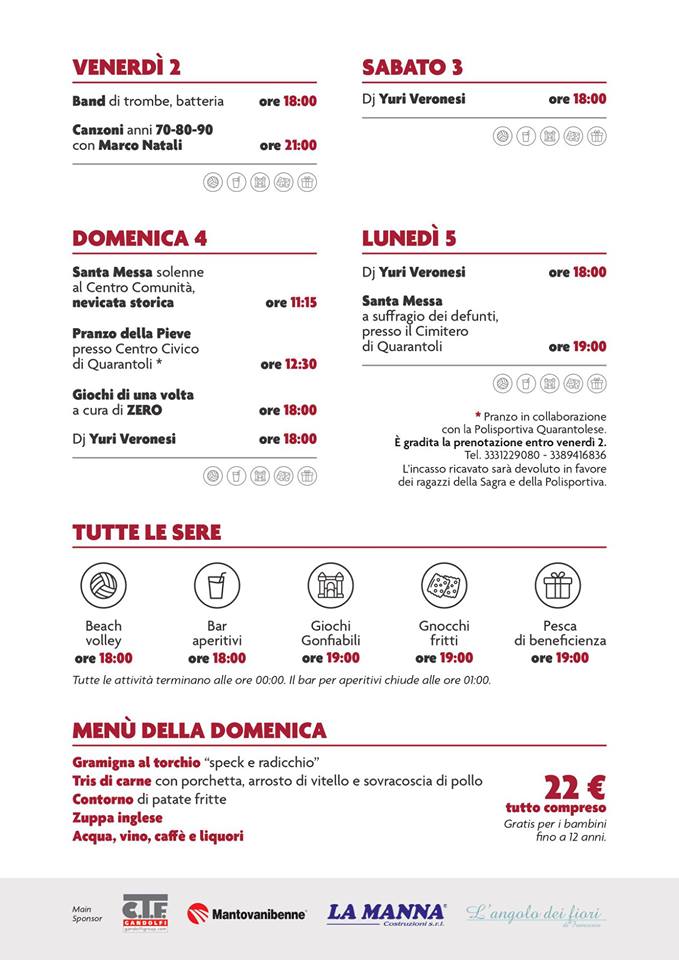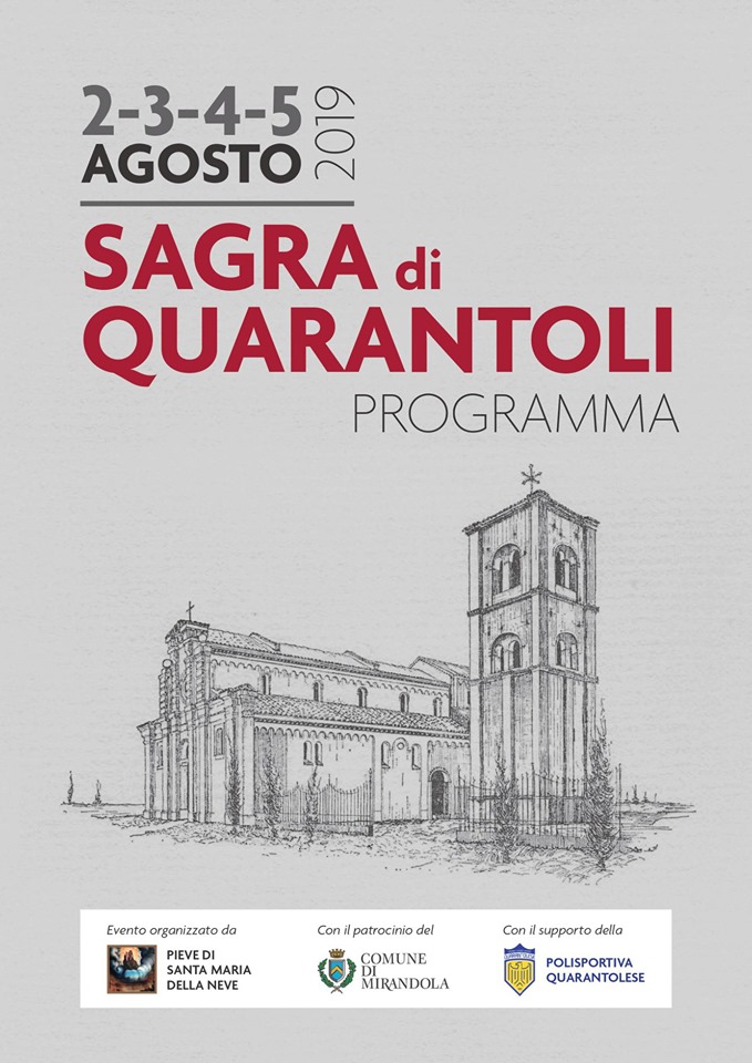 Da venerdì 2 a lunedì 5 agosto 2019 si terrà la tradizionale sagra di Quarantoli, evento organizzato dalla Pieve di Santa Maria della Neve con il patrocinio del Comune di Mirandola ed il supporto della Polisportiva Quarantolese.