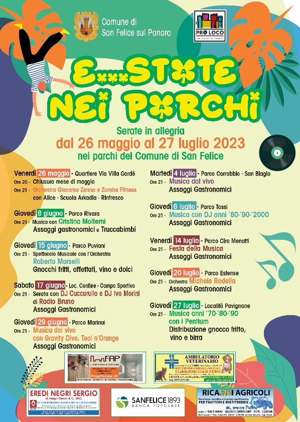 Torna a San Felice sul Panaro “E…state nei parchi”, dal 26 maggio al 27 luglio, una vera e propria “maratona” di due mesi di musica, cibo e allegria nei luoghi “green” cittadini.