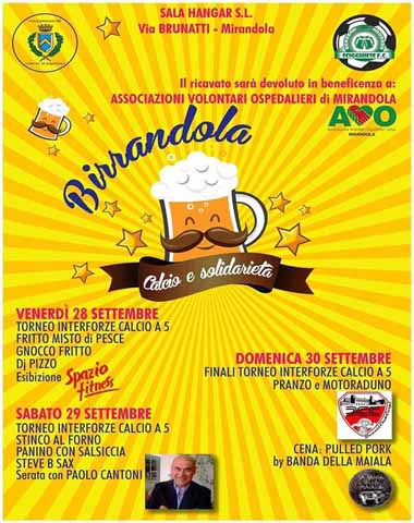 Da venerdì 28 a domenica 30 settembre, dalle ore 18, presso il circolo tennis “Brunatti” di Mirandola, si svolgerà “Birrandola-calcio e solidarietà”, iniziativa che prevede musica, gastronomia, spettacoli e sport a scopo di beneficenza.
