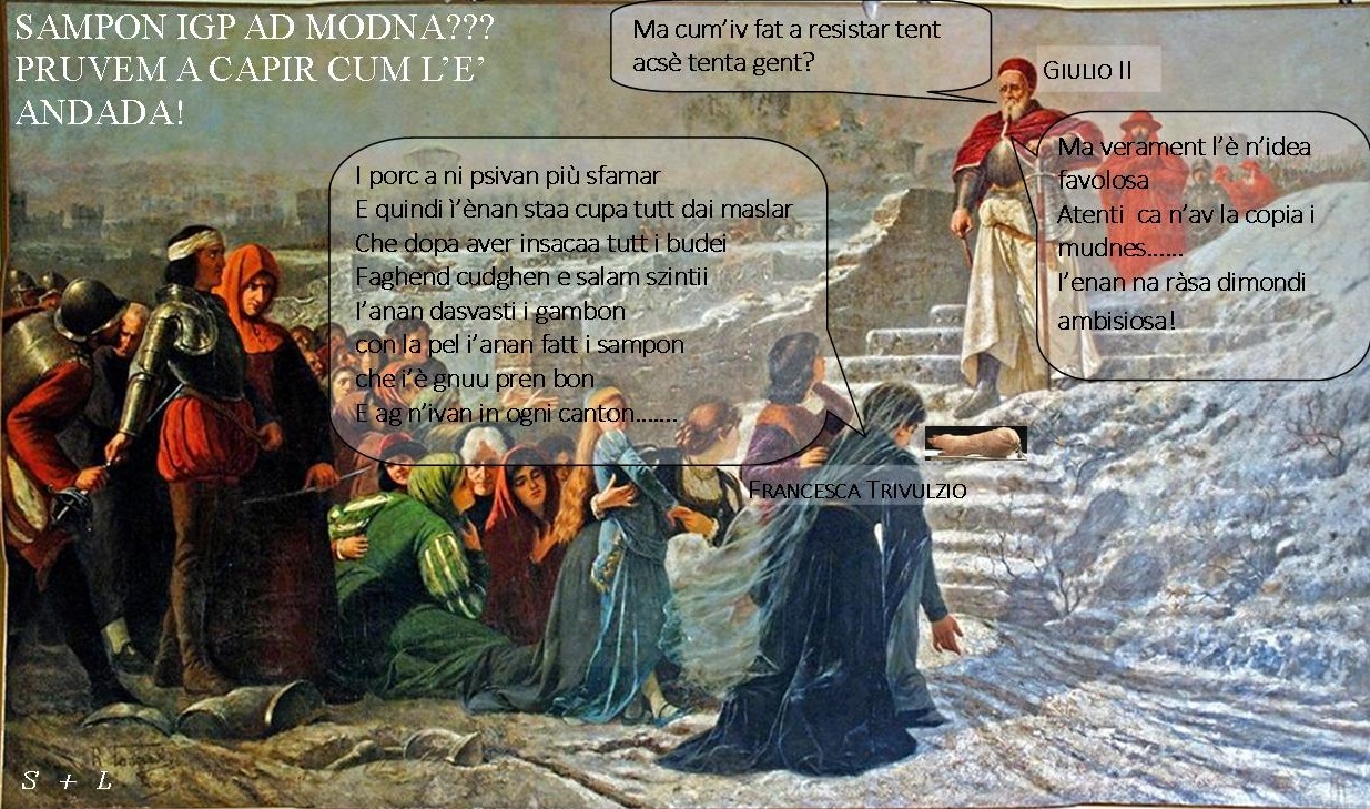 Na volta purtaa dentar però i porc i gh’ivan bisogn ad magnar, ma in piasa a la Mirandla, an gh’ira minga tenti giandi o furminton o remul da far la szota e alora a g’armagniva na solusion sola: cupar tutt i porc e far di salam e di cudghèn. A forsa ad cuparan e ad far di salam e di cudghèn però, i maslar mirandules i s’è res cont che in gh’ivan minga budei a suficiensa e fora da Mirandla, dopa al 19 ad dicembar ,an s’apsiva più andaran a cumprar parchè l’esercit ad Giulio II° al l’iva circundada. Pensa e ripensa cuma far, parchè enca se l’inveran l’ira piuttost fredd, a gh’ira al ris/c ad vedar marsir la carna, parchè i frigo in n’ira ancora staa invintaa, un di maslar a gh’è gnu n’idea; inveci ad butar via la codga dal gambi di porc, l’à pruvaa a dasvastirli sensa taiarli e a la fèn al li à impinidi ad carna da cudghèn ….. bè mo l’à invintaa al sampòn ! In cal modo chè è staa salvaa la carna e a la fèn i mirandules i’han psu resistar più d’un mees sota assedi dal Papa Giulio II° che al gl’à cavada a scavalcar la mura sol al 20 da sznar dal 1511.